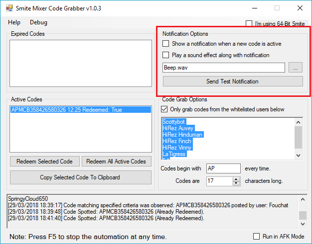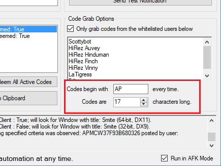 8) Once you have setup the program using the previous steps you can tick the AFK Mode box which will redeem codes as they come in automatically (MAKE SURE SMITE IS KEPT RUNNING AT ALL TIMES, IT CAN BE MINIMISED AND STILL FUNCTION!).
