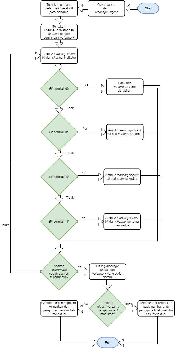 Pada dasarnya, pixel indicator technique merupakan teknik yang memanfaatkan least significant bit untuk menyembunyikan watermark pada gambar target (selanjutnya, akan disebut carrier) yang memiliki channel RGB. Penjelasan mengenai teknik ini dapat dilihat melalui flowchart dibawah ini.