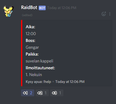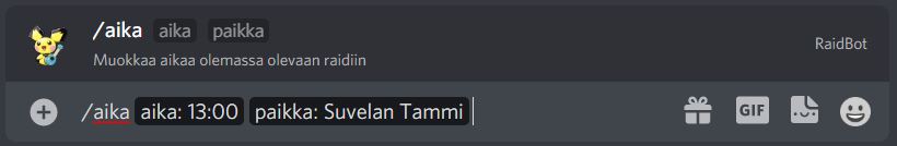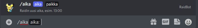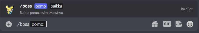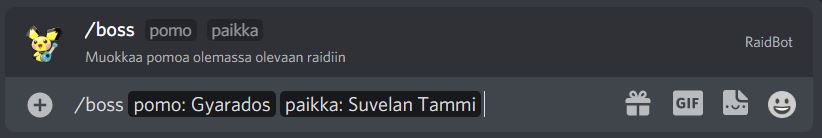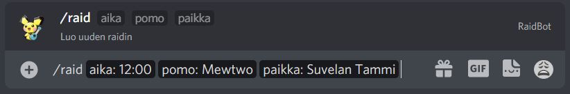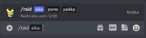 Discord pogo raid bot Supports Discord slash commands Creating a raid: See legacy commands section for an example of the result.´ -- Changing boss to a raid: -- Changing time to a raid: -- Available legacy commands !raid TIME BOSS LOCATION i.e. !raid 12:00 Gengar suvelan kappeli You can sign up to the raid by clicking on one of the reactions Fix/change the time for a raid !aika TIME LOCATION i.e. !aika 12:15 suvelan kappeli Fix/change bosses name for a raid !boss BOSS LOCATION i.e. !boss Mewtwo suvelan kappeli