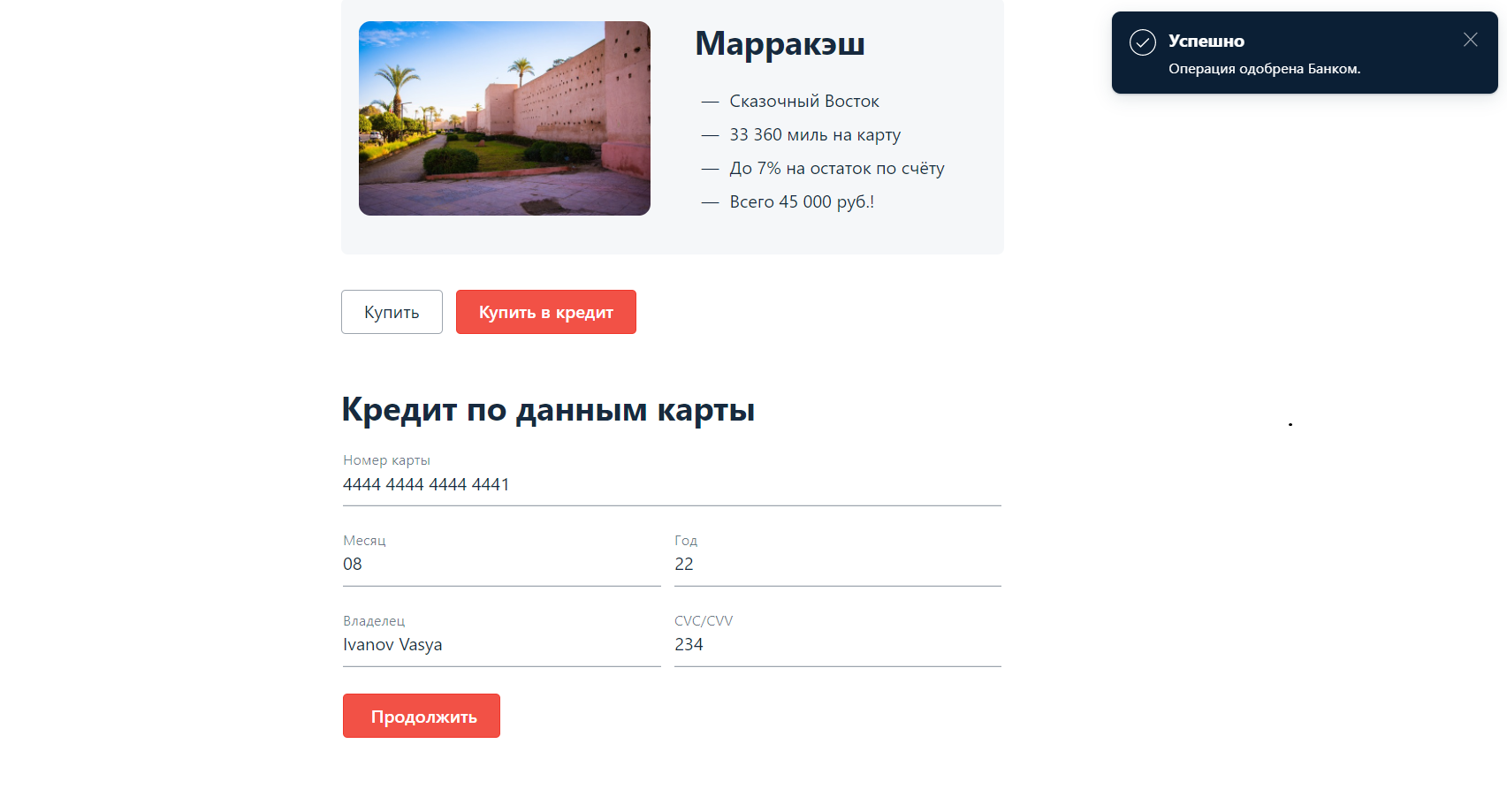 - Заполнить поля (номер карты ("4444 4444 4444 4441"), месяц ("08"), год ("22"), владелец ("Vasya Ivanov"), CVC ("234"))