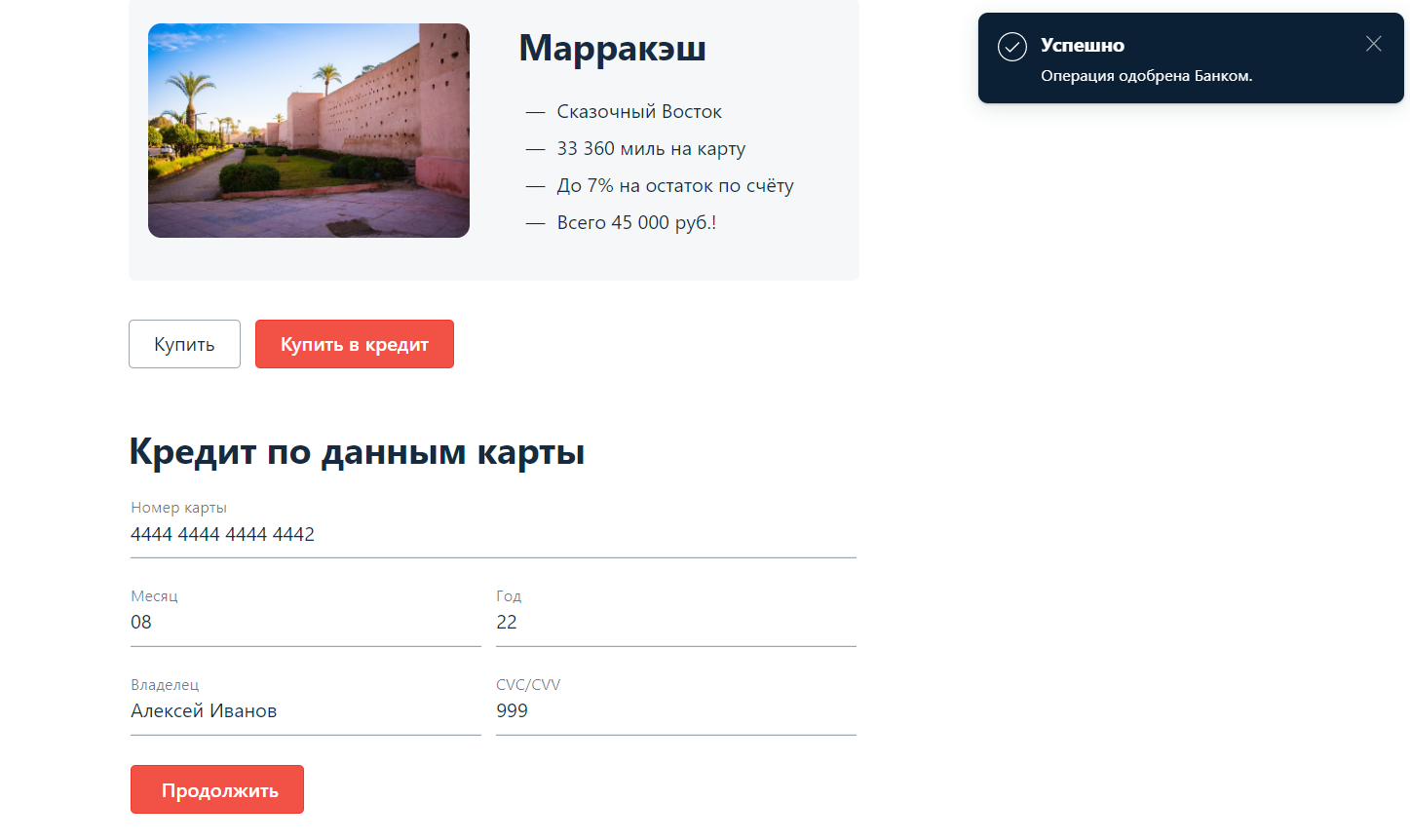 - Заполнить поля (номер карты ("4444 4444 4444 4442"), месяц ("08"), год ("22"), владелец ("Алексей Иванов"), CVC ("999"))