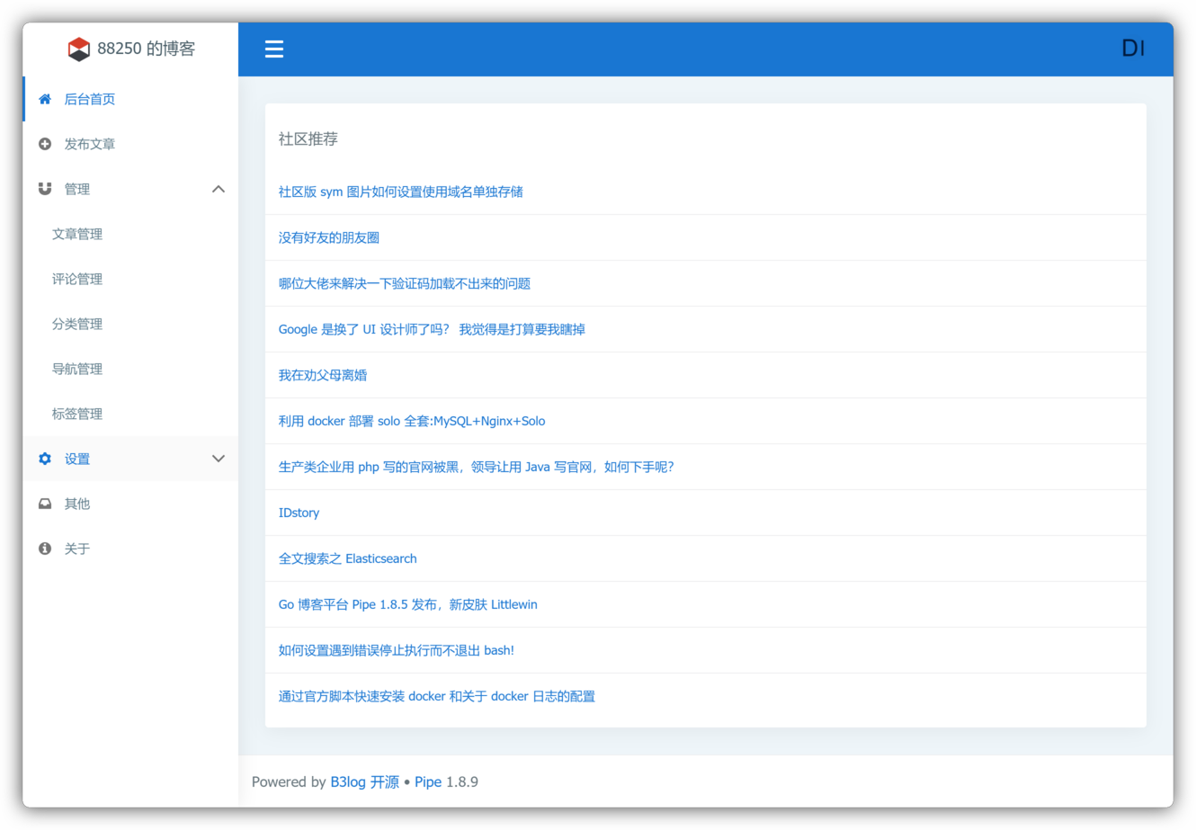 Pipe 是一款小而美的开源博客平台,专为程序员设计。Pipe 有着非常活跃的社区,可将文章作为帖子推送到社区,来自社区的回帖将作为博客评论进行联动(具体细节请浏览 B3log 构思 - 分布式社区网络)。