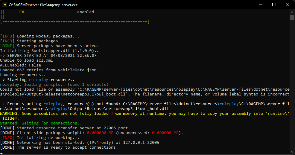 I can compile owl_boot.dll but I get an error when trying to start the server |