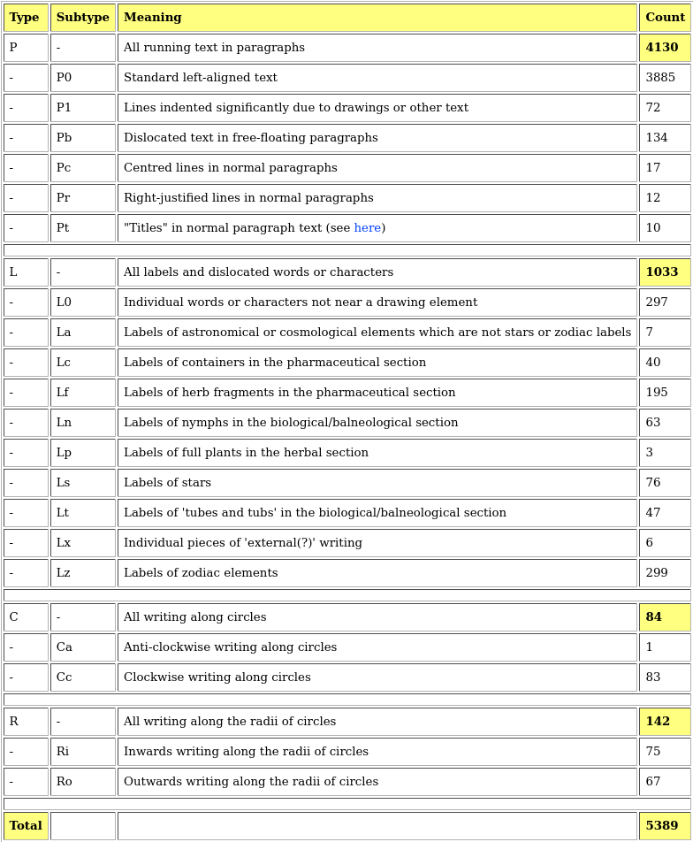 <f17r>: Indicates the beginning of a new page, in this case, folio 17, right side. Following will be meta comments about the contents of page.<f17r.N@Ab>:Nis the current count of this locus as an identified unique section of text on the current page.@Abis a code which gives some more insight into the grouping of text section types that this locus is a part of (See below).<f17r.N@Ab;T>:Tidentifies the transcriber of this particular locus.