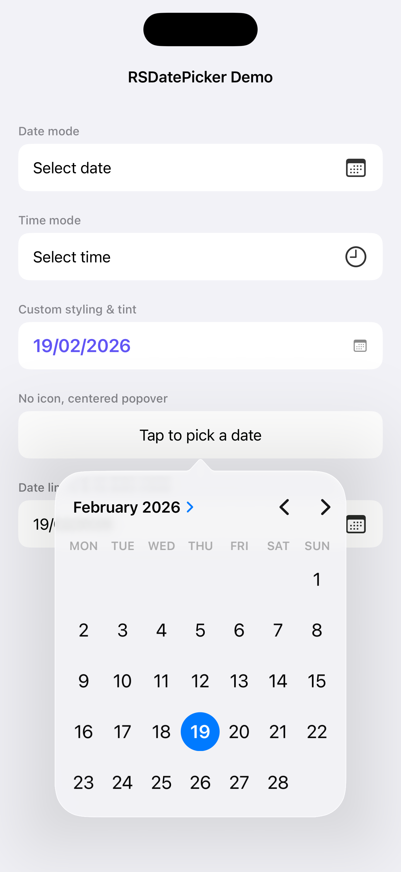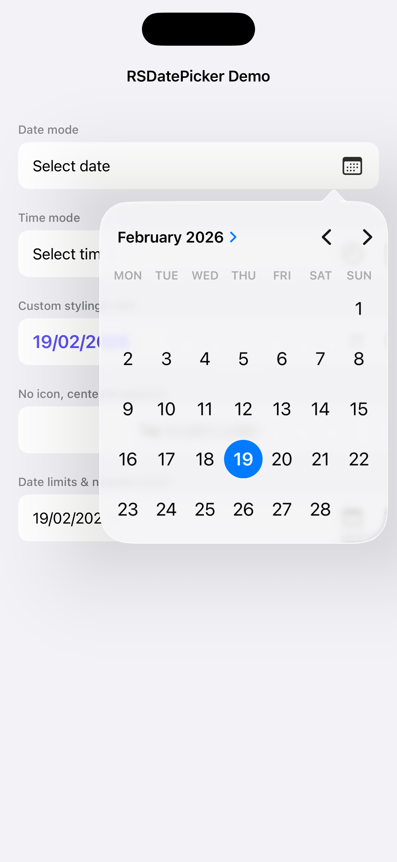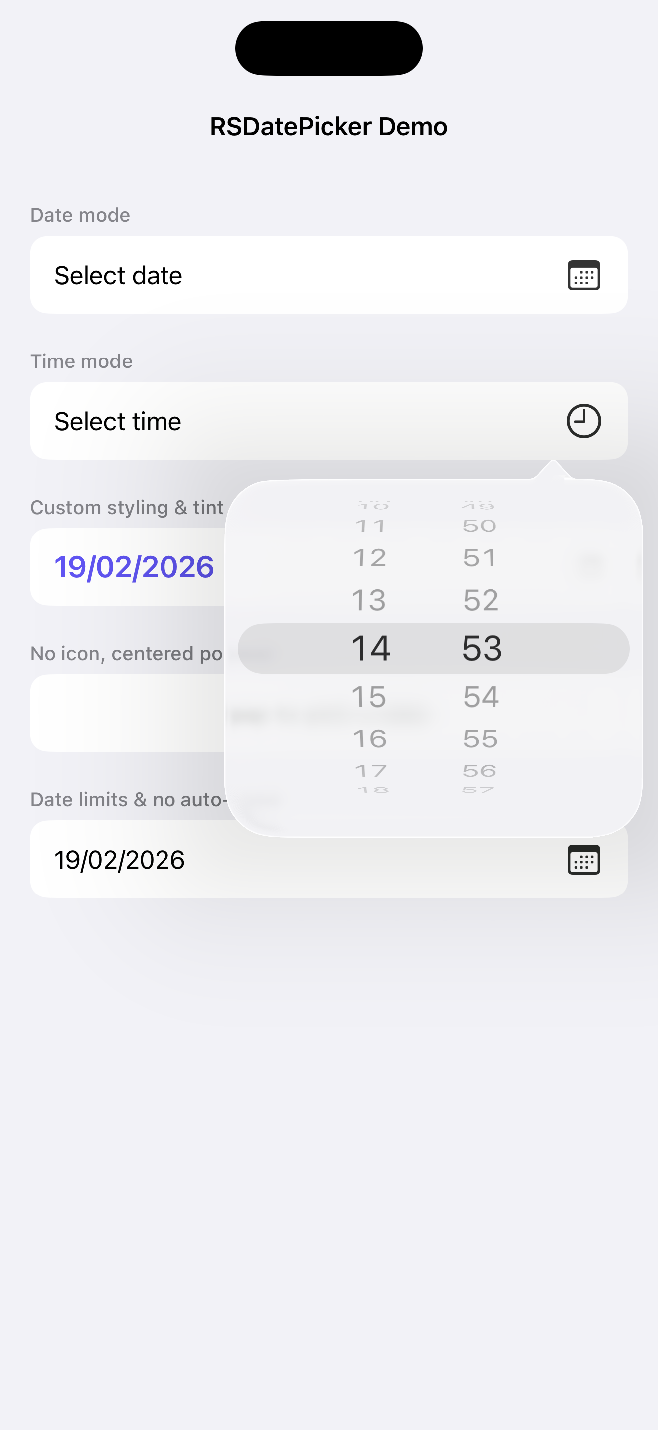viewIBOutlet is removed. Background color is set directly on theRSDatePickerinstance. @available(iOS 15.0, *)annotations are removed since the package declares iOS 15 minimum.- The icon automatically switches between