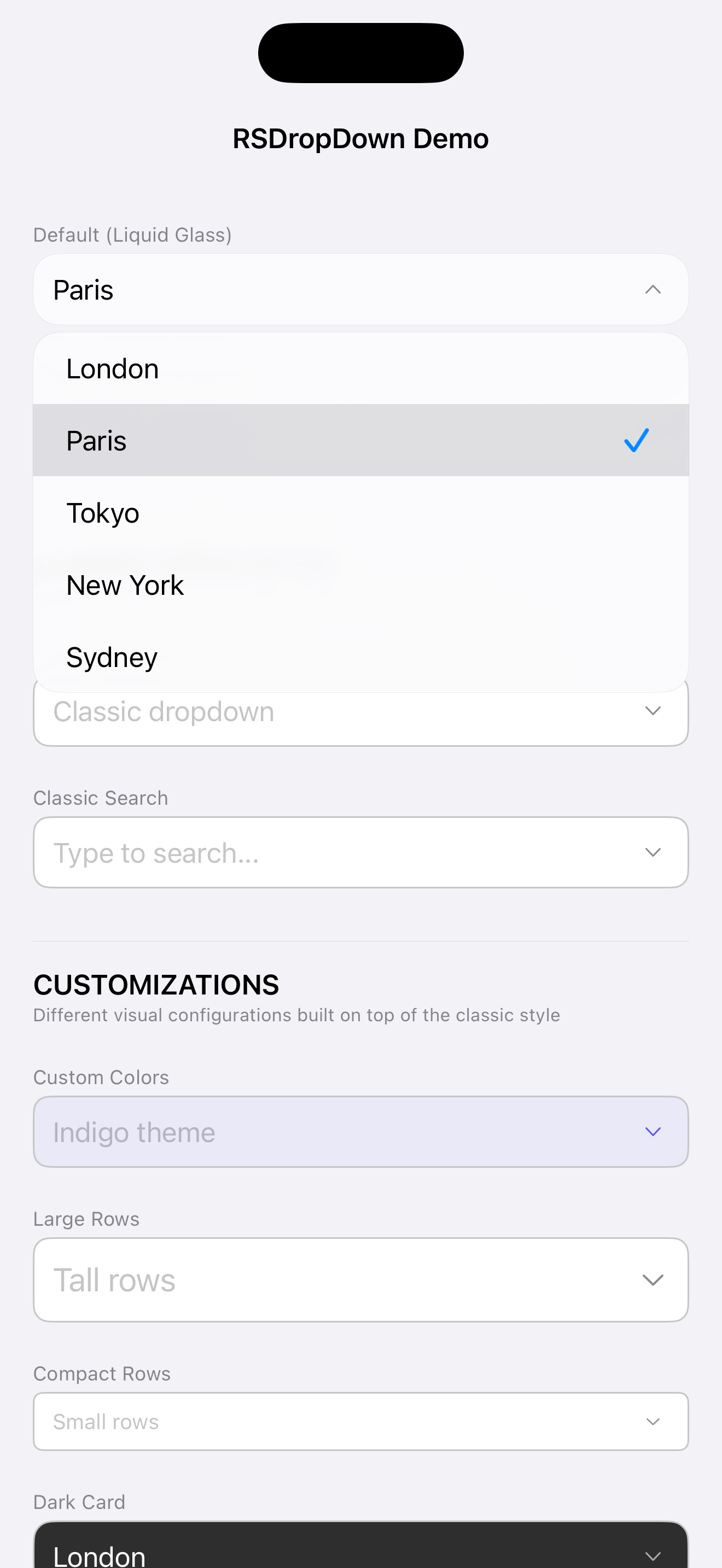 RSDropDownPicker(items: cities, selection: $selection, placeholder: "Pick a city")