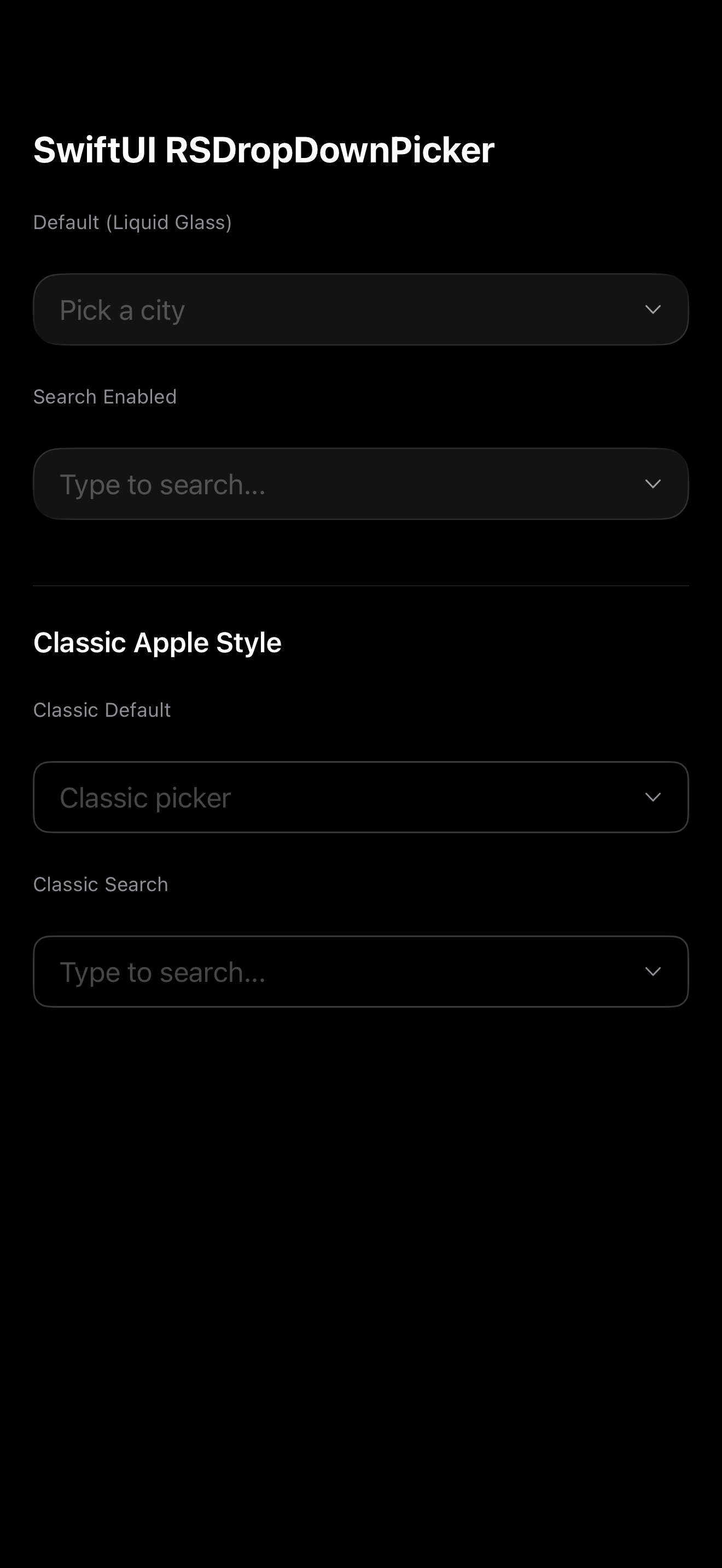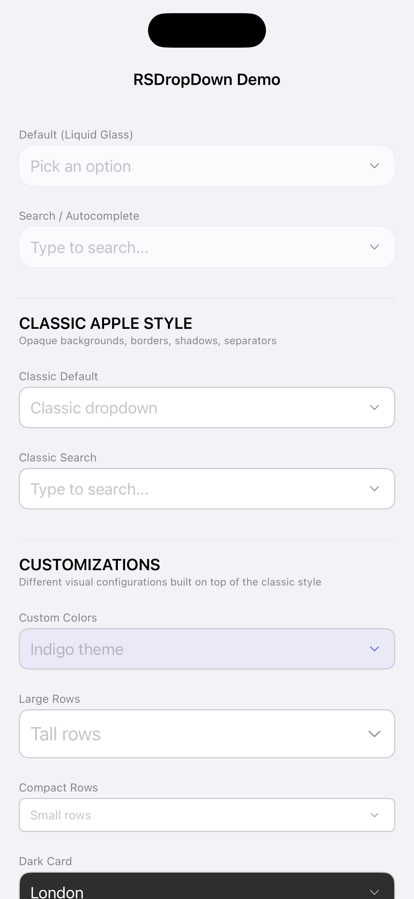 A dropdown component for iOS with two built-in styles: Liquid Glass (default, iOS 26+) and Classic Apple.