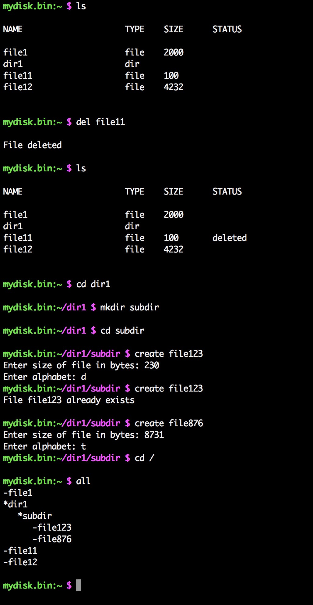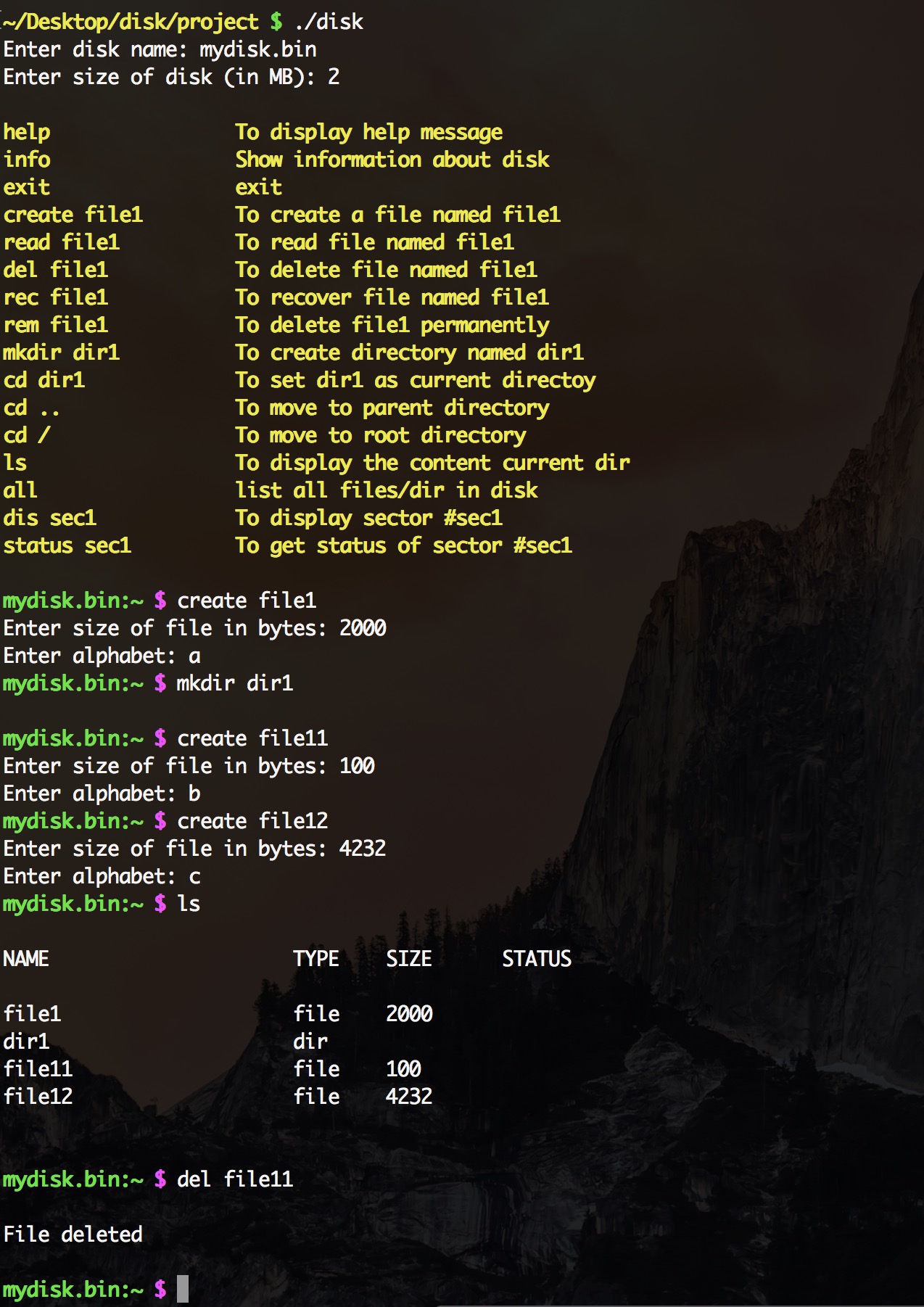 $ ./diskAll read and write operations are done sector by sector. Some sectors are reserved for storing status of other sectors. As soon as user creates a new directory, 2 sectors are reserved for it. Entry for any dir/file is of 32 bytes. Whenever changes are made to any sector, its status is changed simultaneously.