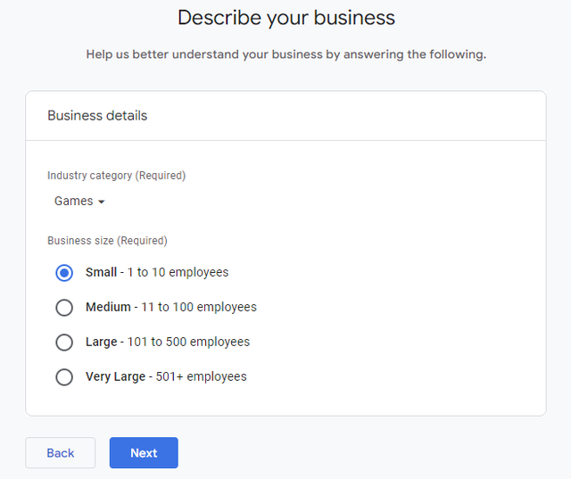 • Select an industry (ex. Games) and business size (ex. Small) --> Next.