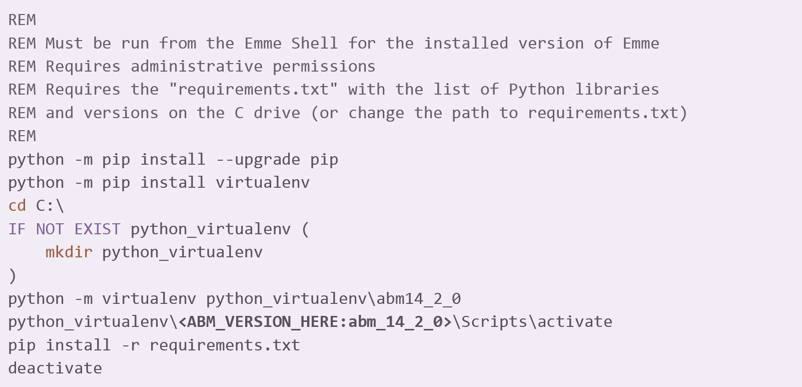 Check add_python_virtualenv.bat to be similar to the example shown below. Verify that the batch file refers to the proper ABM version (e.g. abm_14_2_0).