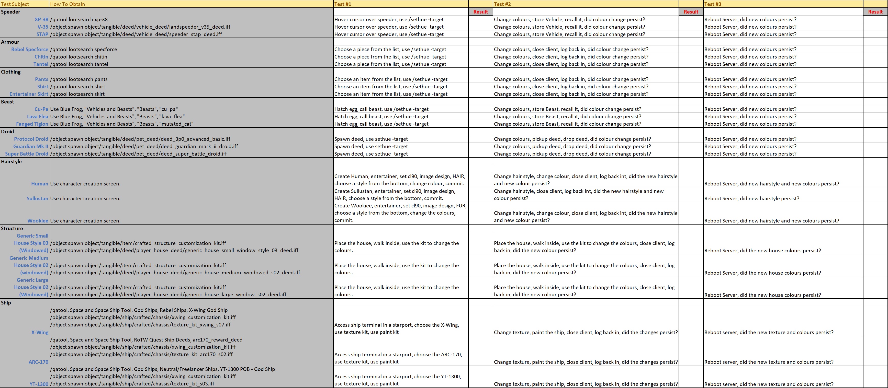 Because a new ACM file affects every player customisable object in the game we need a quicker way than testing all of them. The screenshot here shows the attached ACM testing protocol spreadsheet which breaks down common categories of player customisable objects and has three of each listed. There are then three tests you can perform for each object to see if your current ACM file is broken or not.