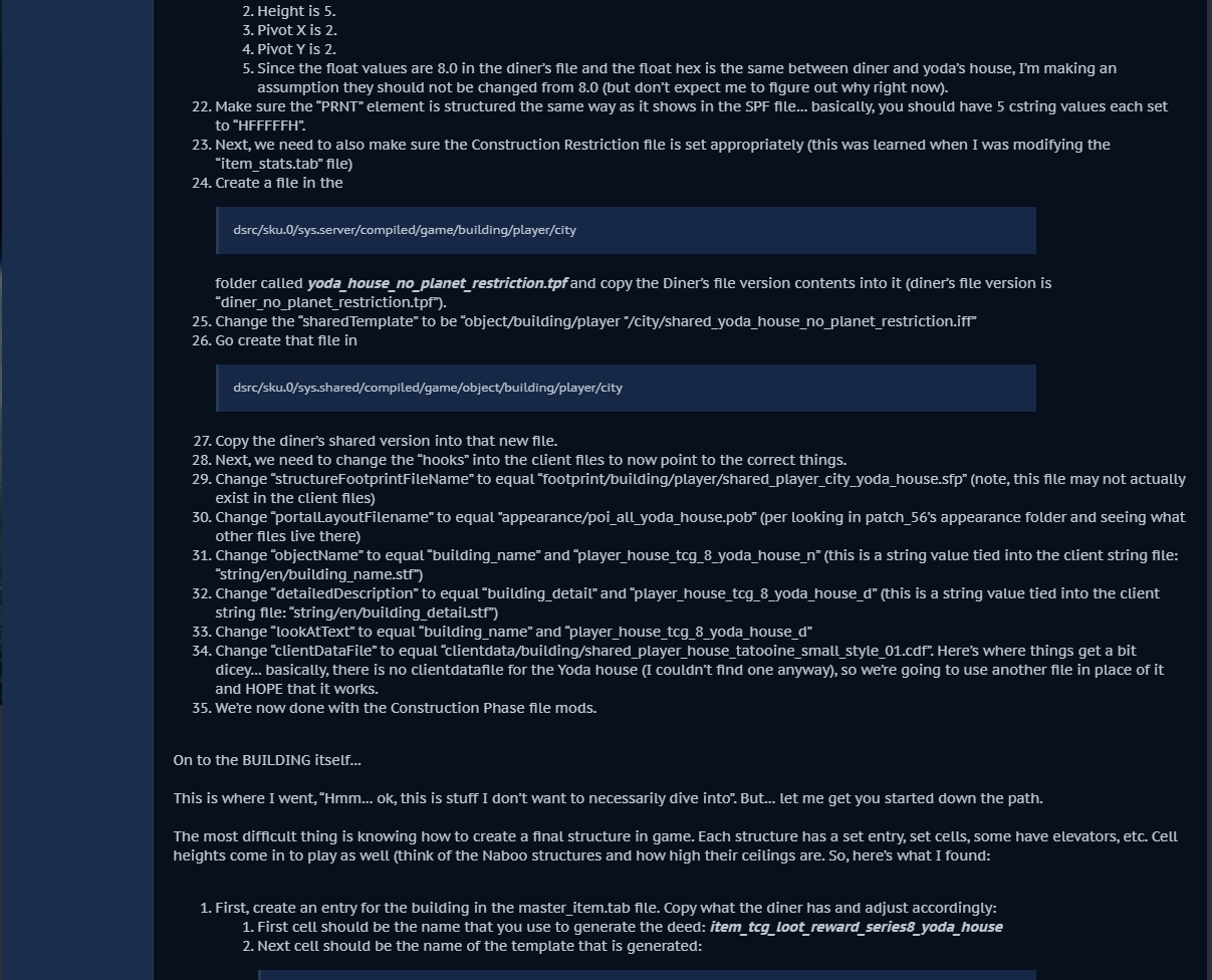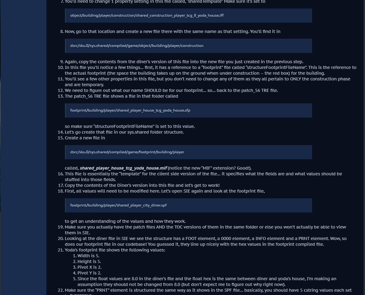 Let’s first open the player_structure.tab and make sure the game knows how to build the house. Open dsrc/sku.0/sys.server/compiled/game/datatables/structure/player_structure.tab Add a new line, copying from what is listed for the diner, and change the following values: Change the first value to object/building/player/player_house_tcg_8_yoda_house.iff . This is the structure template file. Change the next value to object/building/player/construction/construction_player_house_tcg_8_yoda_house.iff This is the construction template file. Change the “Lot_Reduction” value to “2” – this should be how many lots are deducted when placed. Change the “Eject_Range” value to 32. Change the “Maint_Rate” to 13. This is how much the building costs in maintenance. Adjust the other values as you see fit. On the next line, the terminal is defined. Play with the values and make sure it’s in the right cell (should probably be “entry”) in order to spawn it correctly as it likely doesn’t spawn correctly when using the diner’s values. Come back to this once you can place the building. Once the building is placed, you'll be able to first see what room/cell the terminal SHOULD be in (by using Ctrl-Shift-G when in game) and then you can figure out where you'd like to place it (i.e. by figuring out coordinates when in game). If you plan to hang signs, you’ll need to add values in the “player_structure_sign.tab” file in the same folder. I’ll leave this for experimentation, but remember sign placement is also done by the code as well depending on what building it's being placed on. The exact script that controls this escapes me at the moment - do a file search for the template name of the sign you wish to hang and you'll likely find it. Open the Diner’s construction file located here: dsrc/sku.0/sys.server/compiled/game/object/building/player/construction/construction_player_diner.tpf Create a new file for Yoda’s Hut in the SAME folder… name it construction_player_tcg_8_yoda_house.tpf Copy the contents of the diner’s construction file into the new Yoda construction file you just created. You’ll need to change 1 property setting in this file called, “sharedTemplate” Make sure it’s set to object/building/player/construction/shared_construction_player_tcg_8_yoda_house.iff Now, go to that location and create a new file there with the same name as that setting. You’ll find it in dsrc/sku.0/sys.shared/compiled/game/object/building/player/construction Again, copy the contents from the diner’s version of this file into the new file you just created in the previous step. In this file you’ll notice a few things… first, it has a reference to a “footprint” file called “structureFootprintFileName”. This is the reference to the actual footprint (the space the building takes up on the ground when under construction – the red box) for the building. You’ll see a few other properties in this file, but you don’t need to change any of them as they all pertain to ONLY the construction phase and are temporary. We need to figure out what our name SHOULD be for our footprint… so… back to the patch_56 TRE file. The patch_56 TRE file shows a file in that folder called footprint/building/player/shared_player_house_tcg_yoda_house.sfp so make sure “structureFootprintFileName” is set to this value. Let’s go create that file in our sys.shared folder structure. Create a new file in dsrc/sku.0/sys.shared/compiled/game/footprint/building/player called, shared_player_house_tcg_yoda_house.mif (notice the new “MIF” extension? Good!). This file is essentially the “template” for the client side version of the file… it specifies what the fields are and what values should be stuffed into those fields. Copy the contents of the Diner’s version into this file and let’s get to work! First, all values will need to be modified here. Let’s open SIE again and look at the footprint file, footprint/building/player/shared_player_city_diner.spf to get an understanding of the values and how they work. Make sure you actually have the patch files AND the TOC versions of them in the same folder or else you won’t actually be able to view them in SIE. Looking at the diner file in SIE we see the structure has a FOOT element, a 0000 element, a INFO element and a PRNT element. Wow, so does our footprint file in our codebase! You guessed it, they line up nicely with the hex values in the footprint compiled file. Yoda’s footprint file shows the following values: Width is 5. Height is 5. Pivot X is 2. Pivot Y is 2. Since the float values are 8.0 in the diner’s file and the float hex is the same between diner and yoda’s house, I’m making an assumption they should not be changed from 8.0 (but don’t expect me to figure out why right now). Make sure the “PRNT” element is structured the same way as it shows in the SPF file… basically, you should have 5 cstring values each set to “HFFFFFH”. Next, we need to also make sure the Construction Restriction file is set appropriately (this was learned when I was modifying the “item_stats.tab” file) Create a file in the dsrc/sku.0/sys.server/compiled/game/building/player/city folder called yoda_house_no_planet_restriction.tpf and copy the Diner’s file version contents into it (diner’s file version is “diner_no_planet_restriction.tpf”). Change the “sharedTemplate” to be “object/building/player "/city/shared_yoda_house_no_planet_restriction.iff” Go create that file in dsrc/sku.0/sys.shared/compiled/game/object/building/player/city Copy the diner’s shared version into that new file. Next, we need to change the “hooks” into the client files to now point to the correct things. Change “structureFootprintFileName” to equal “footprint/building/player/shared_player_city_yoda_house.sfp” (note, this file may not actually exist in the client files) Change “portalLayoutFilename” to equal "appearance