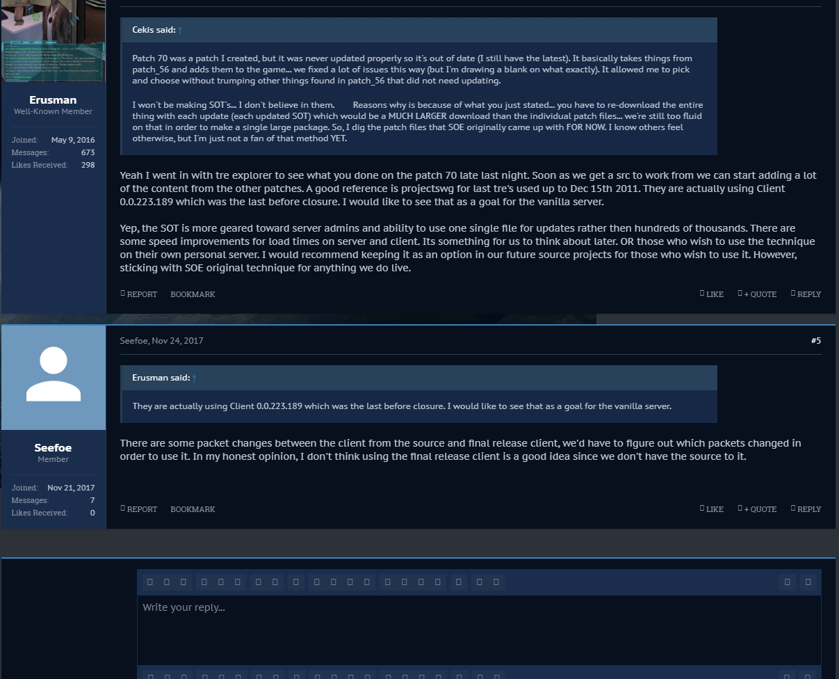 Yep, the SOT is more geared toward server admins and ability to use one single file for updates rather then hundreds of thousands. There are some speed improvements for load times on server and client. Its something for us to think about later. OR those who wish to use the technique on their own personal server. I would recommend keeping it as an option in our future source projects for those who wish to use it. However, sticking with SOE original technique for anything we do live. REPORT BOOKMARKLIKE + QUOTE REPLY Seefoe Seefoe Member Joined:Nov 21, 2017 Messages:7 Likes Received:0 #5Seefoe, Nov 24, 2017 Erusman said: ↑ They are actually using Client 0.0.223.189 which was the last before closure. I would like to see that as a goal for the vanilla server. There are some packet changes between the client from the source and final release client, we'd have to figure out which packets changed in order to use it. In my honest opinion, I don't think using the final release client is a good idea since we don't have the source to it. REPORT BOOKMARKLIKE + QUOTE REPLY Write your reply...