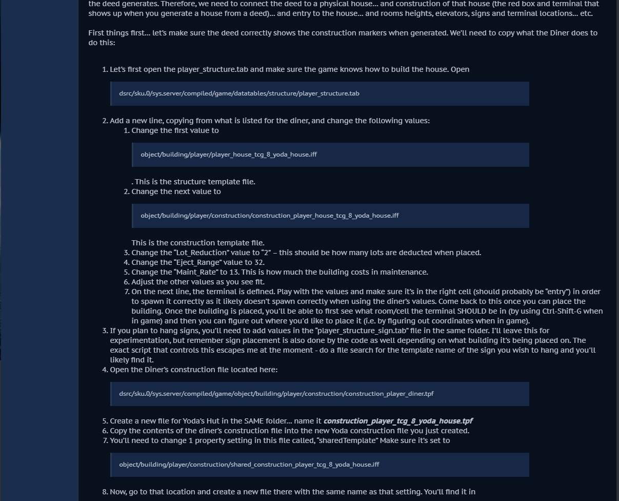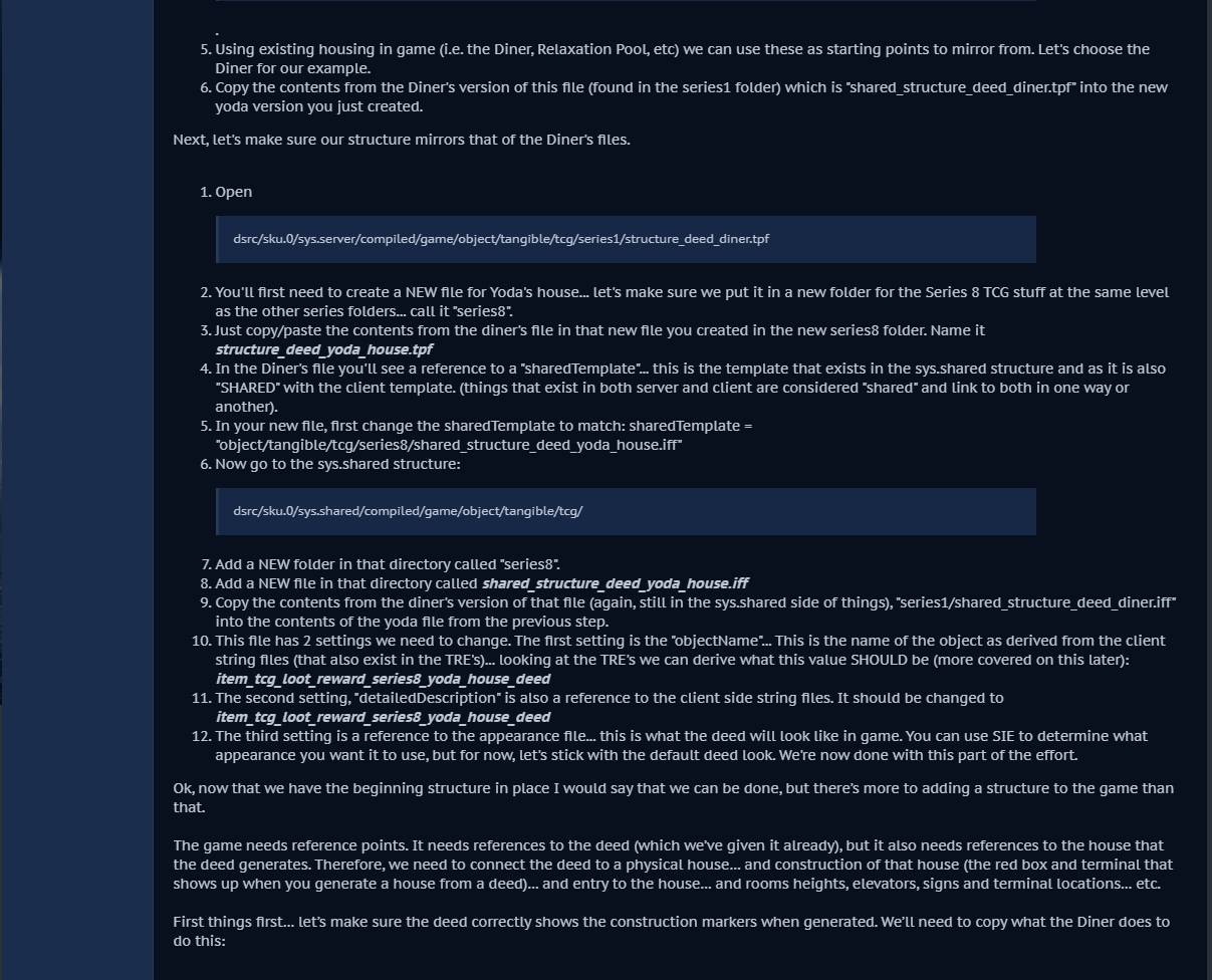 Open dsrc/sku.0/sys.server/compiled/game/object/tangible/tcg/series1/structure_deed_diner.tpf You'll first need to create a NEW file for Yoda's house... let's make sure we put it in a new folder for the Series 8 TCG stuff at the same level as the other series folders... call it "series8". Just copy/paste the contents from the diner's file in that new file you created in the new series8 folder. Name it structure_deed_yoda_house.tpf In the Diner's file you'll see a reference to a "sharedTemplate"... this is the template that exists in the sys.shared structure and as it is also "SHARED" with the client template. (things that exist in both server and client are considered "shared" and link to both in one way or another). In your new file, first change the sharedTemplate to match: sharedTemplate = "object/tangible/tcg/series8/shared_structure_deed_yoda_house.iff" Now go to the sys.shared structure: dsrc/sku.0/sys.shared/compiled/game/object/tangible/tcg/ Add a NEW folder in that directory called "series8". Add a NEW file in that directory called shared_structure_deed_yoda_house.iff Copy the contents from the diner's version of that file (again, still in the sys.shared side of things), "series1/shared_structure_deed_diner.iff" into the contents of the yoda file from the previous step. This file has 2 settings we need to change. The first setting is the "objectName"... This is the name of the object as derived from the client string files (that also exist in the TRE's)... looking at the TRE's we can derive what this value SHOULD be (more covered on this later): item_tcg_loot_reward_series8_yoda_house_deed The second setting, "detailedDescription" is also a reference to the client side string files. It should be changed to item_tcg_loot_reward_series8_yoda_house_deed The third setting is a reference to the appearance file... this is what the deed will look like in game. You can use SIE to determine what appearance you want it to use, but for now, let's stick with the default deed look. We're now done with this part of the effort. Ok, now that we have the beginning structure in place I would say that we can be done, but there’s more to adding a structure to the game than that.