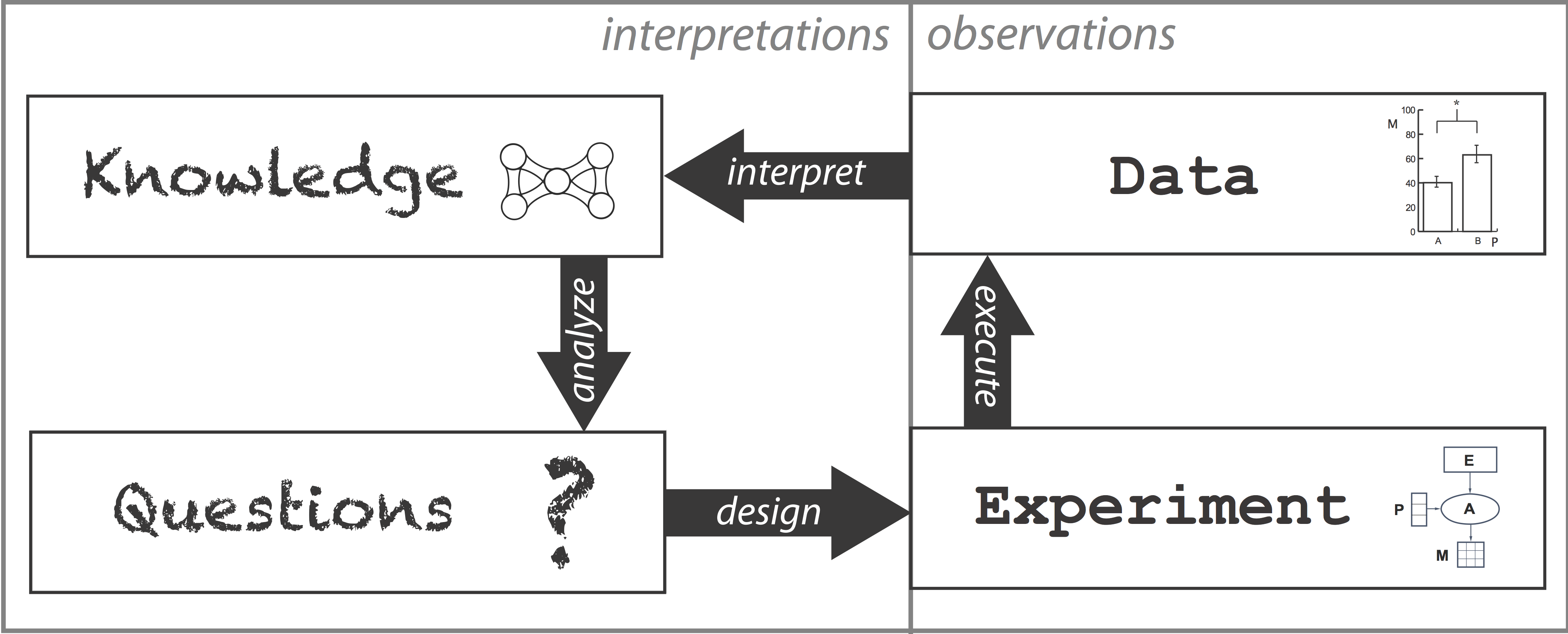 - The model describes a cyclic process that involves abstract entities [Knowledge, Questions, Experiments, Data] and processes [analyze knowledge, design experiments, execute experimental designs, interpret data in context].