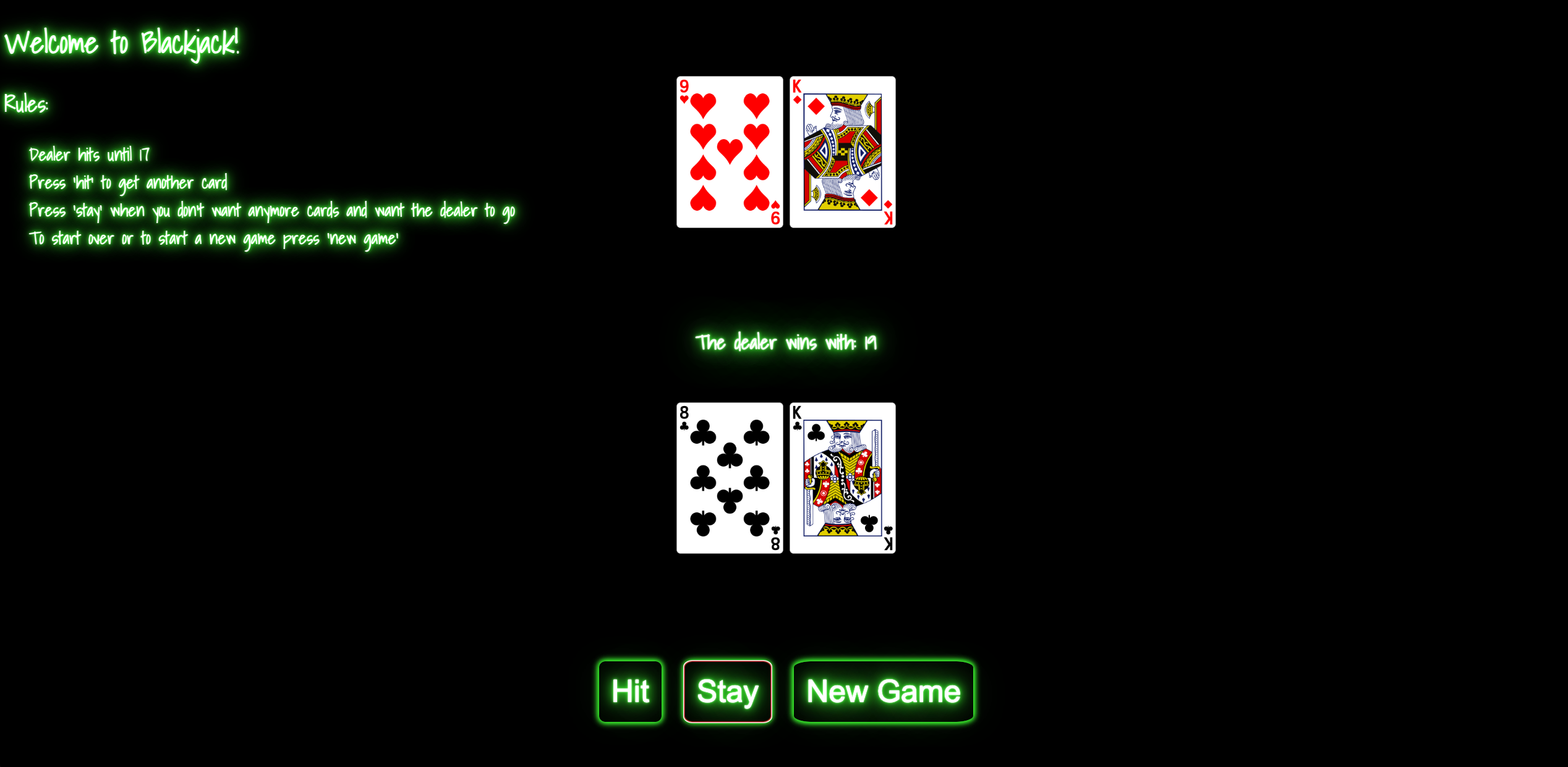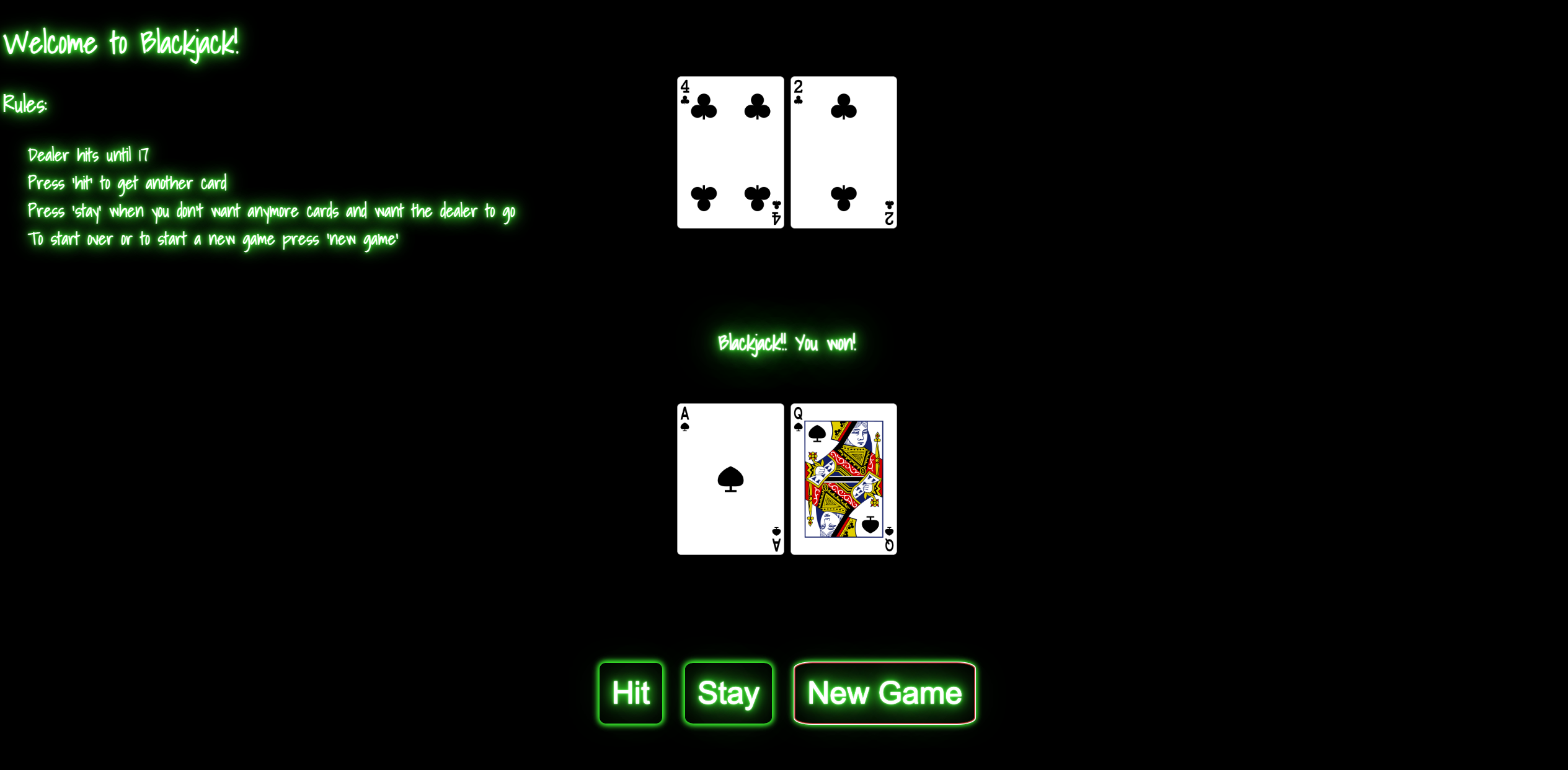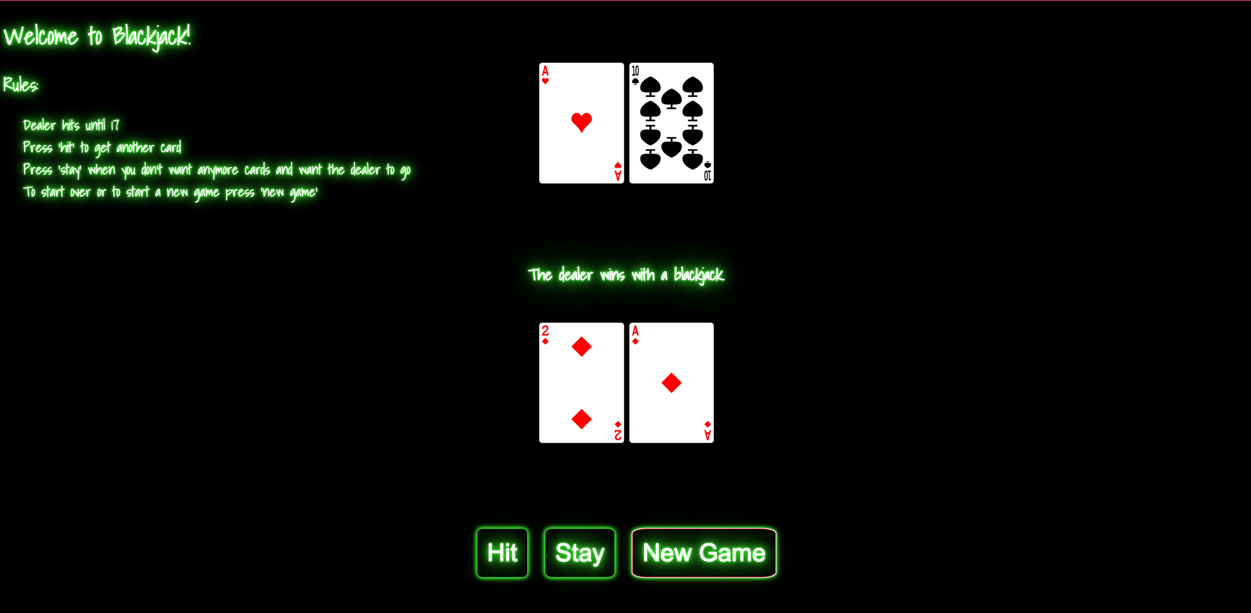 Javascript was used for all of the game logic. All of the cards are based off a Card class. The cards the player and dealer play with are stored in a Deck array. I have 4 functions to populate the deck array with objects from the Card class. One function for each suit of card. The objects contain the card suit, card value, and a picture of the card. The objects also contain functions to get the picture and to get the value of the card. The player and dealer hands are both stores as seperate arrays which remove cards randomly from the deck array as they get delt out. I manipulated the DOM in order to let me display the cards, player and dealer scores, and as well add logic to the buttons.