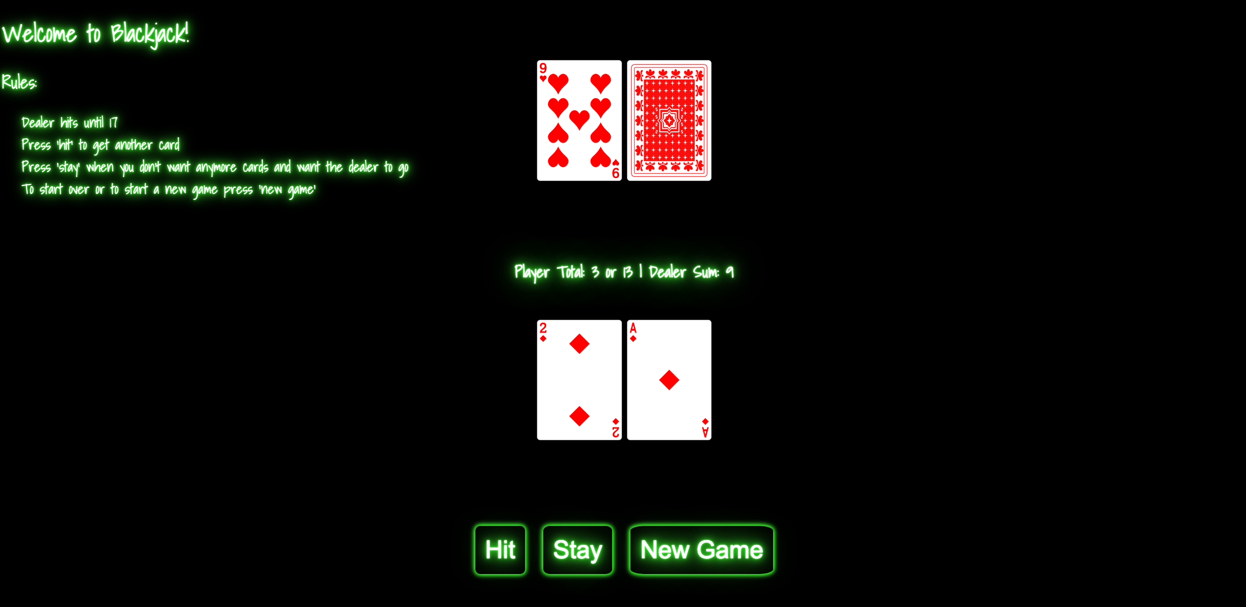 The goal of blackjack is to get as close to 21 points without going over and at the same time have more points than the dealer. The value of the cards are their face value with the exception of Jacks, Queens, Kings and Aces. Jacks, Kings, and Queens count at 10 points while Aces count as 1 or 11 points. At the start of the game the player and the dealer each get delt 2 cards 1 at a time. Everyone can see the players card but only the first card of the dealer is revealed. The player can then choose to hit or stay. If they choose hit then they get dealt another card. They can continue to hit if the total of their cards remain under 21. Once a player hits stay the dealer will be delt card until they reach atleast 17 points. The dealer gets delt cards 1 at a time with 1 second in between cards so they don't all just appear at once. This makes the game a little more realistic. Once the dealer reaches 17 or more points they stop getting cards and whoever has the most points between the player and the dealer wins the game. The player can then press the new game button to start a new game.