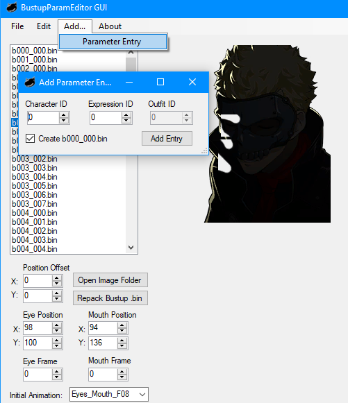 - This version of the program uses the character, expression, and outfit IDs of each parameter entry to create a list of bustups, so custom bustups with unique ids can be created and extracted.