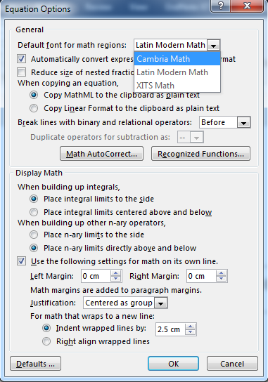 Okay, so you are probably wondering what this MathML beast is. Basically, it's an XML-like mark-up language for math. If all browsers supported it, you'd be seeing the equations above rendered using the browser's characters instead of bitmaps. But regardless, there's one tool that supports it: Word. Microsoft Word 2007, to be precise. There's a little-known trick to get Word to turn equations into MathML. You basically have to locate the equation options...