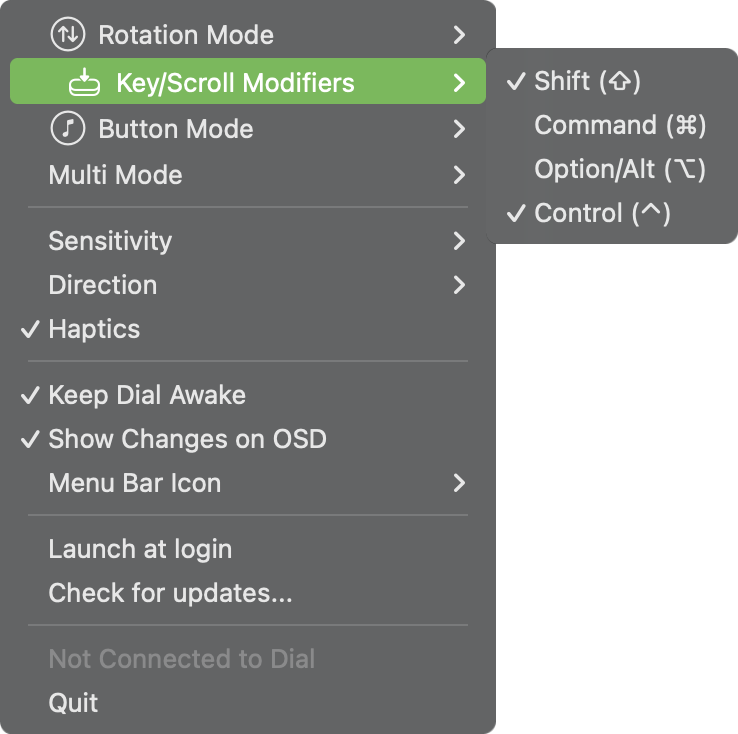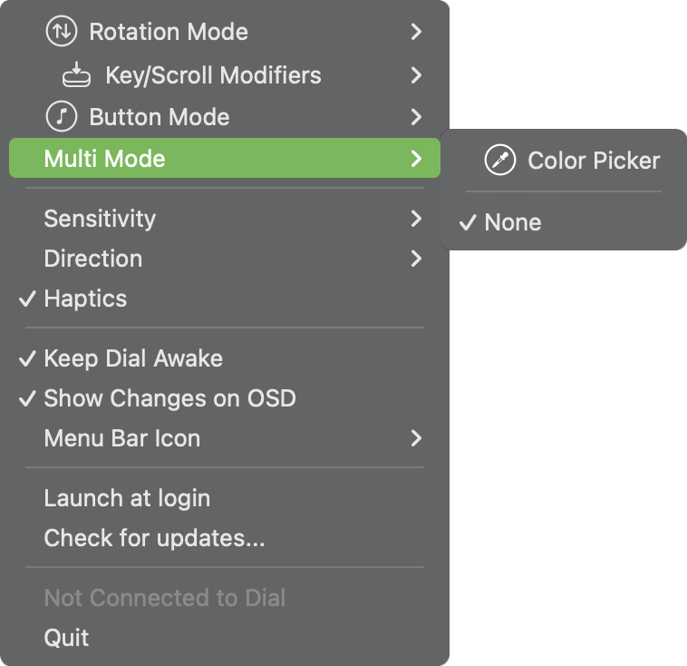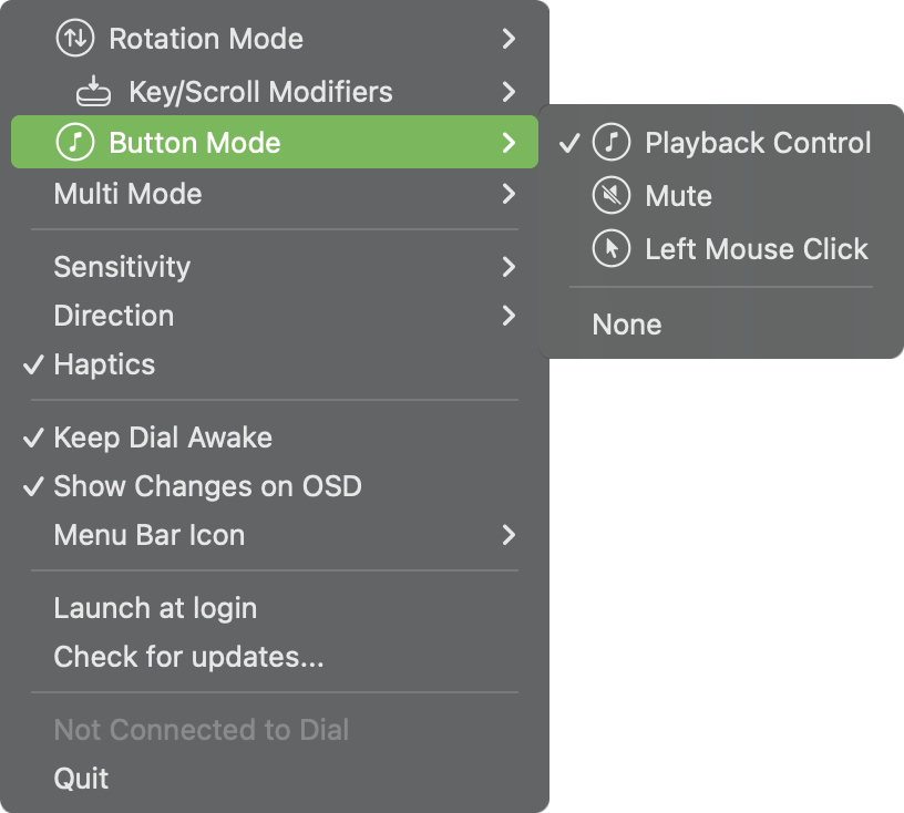 - Button Mode: Allows for pressed feature control with the dial (eg: media control, mouse click)