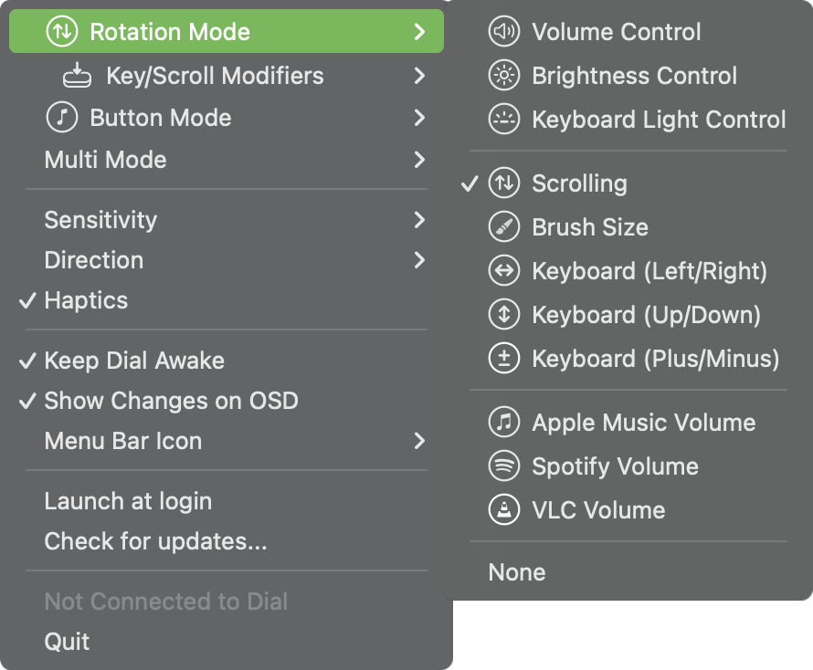 - Rotation Mode: Allows for rotational feature control with the dial (eg: scrolling, volume/brightness control)