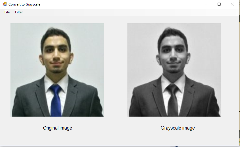 A very simple program allows the user to upload a photo, grayscale it, and save the grayscaled photo. The program was designed using C# language. The code was compiled using visual studio IDE.