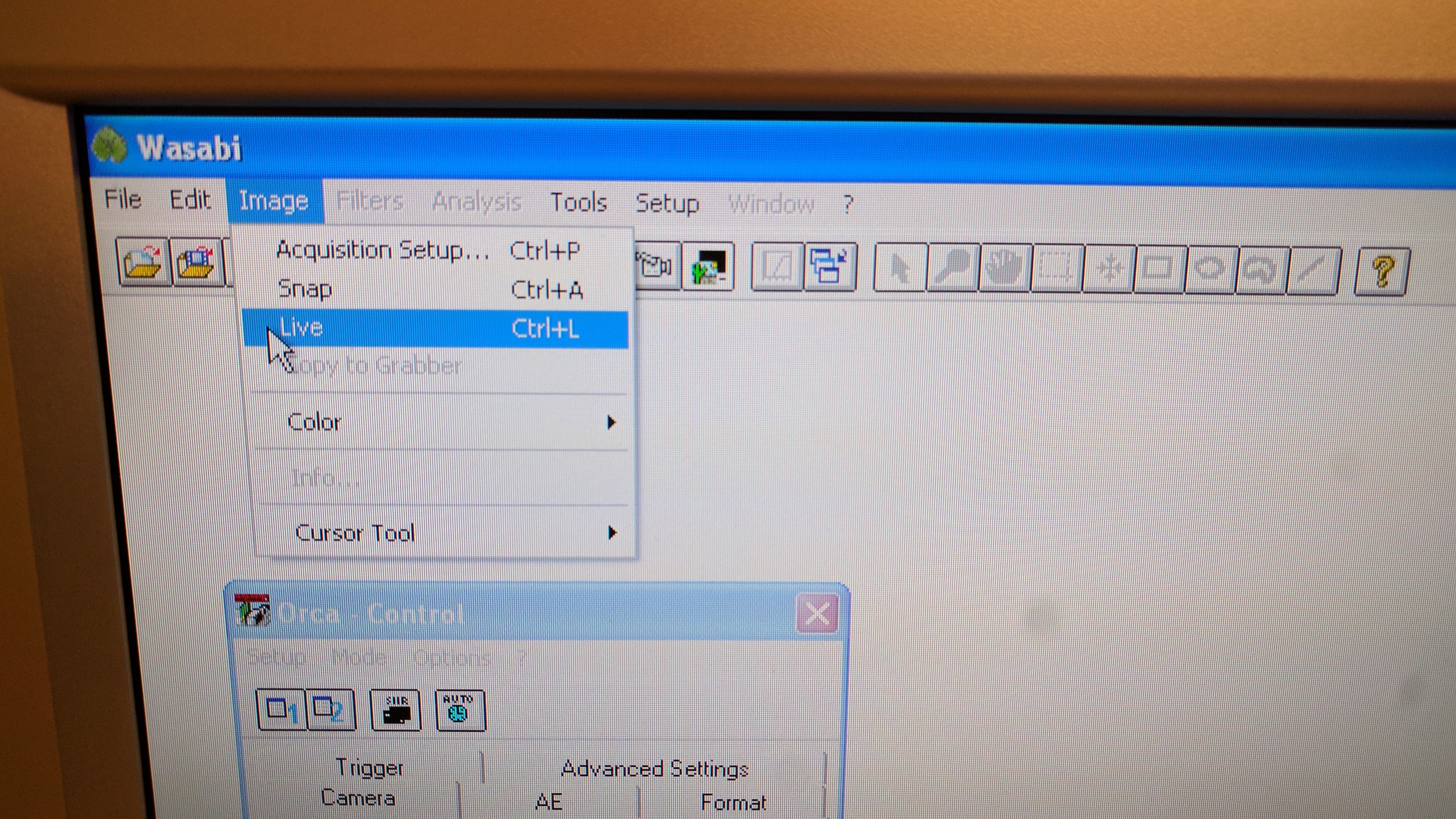 Wasabi, go to the 'Image' panel, under it click 'Live', or simply pressCtrl + L. Live recording from your tissue culture will appear - To take a photo, go to the 'Image' panel again and click 'Snap', or simply press