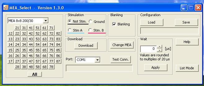 MEA Select, under the "stimulation" panel, click ground. From here, select the broken pins (their numbers should dissapear from display). They are 15, 28, 74, 75, 85 - Click Download, it should read 'Download okay' in the dialog box