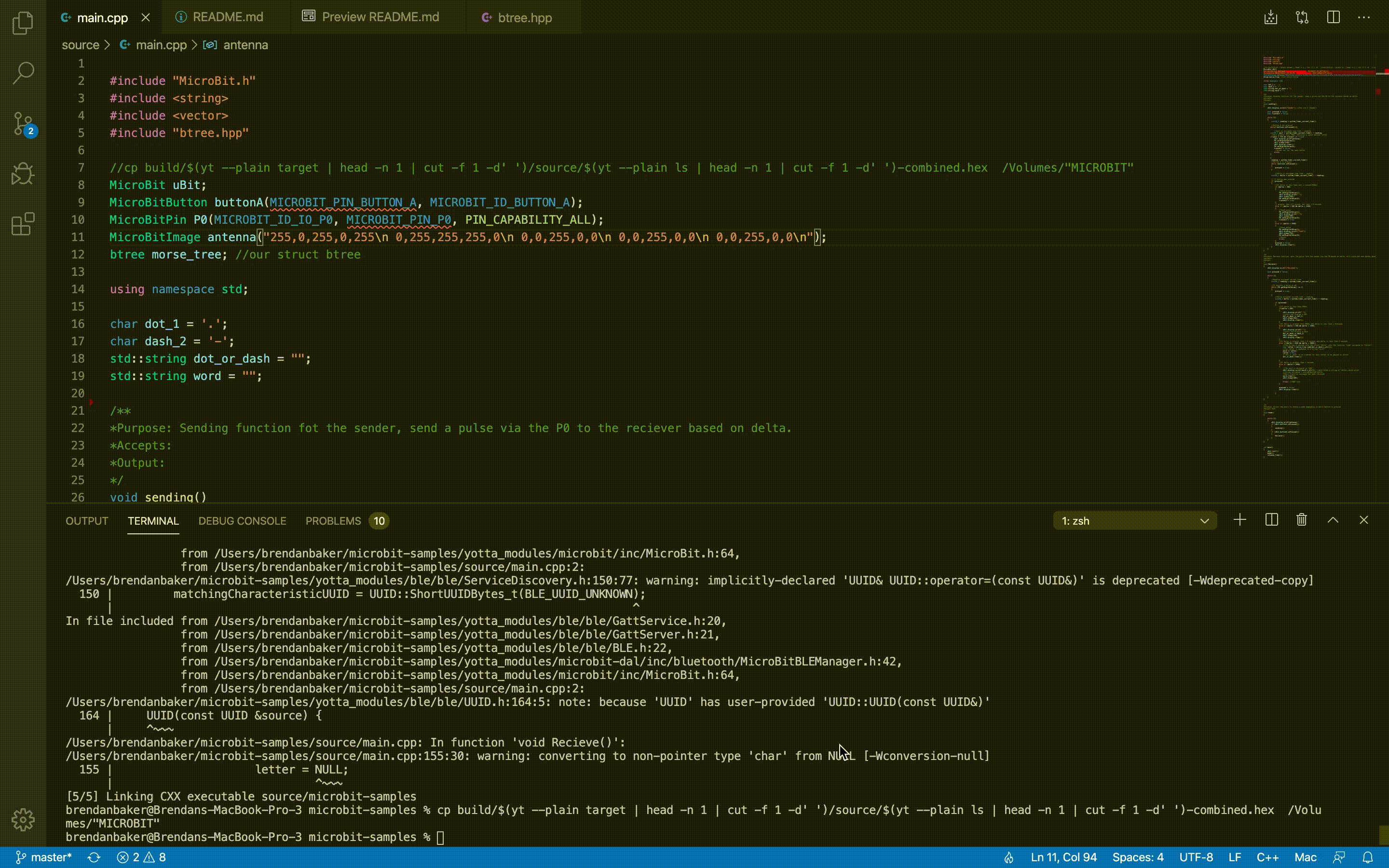 To keep morsecode as realistic as possible we decided to use a binary tree which is how the original morseocde was used. We create a header file called "btree.hpp". The function taking the paramenter is "code" shown below.