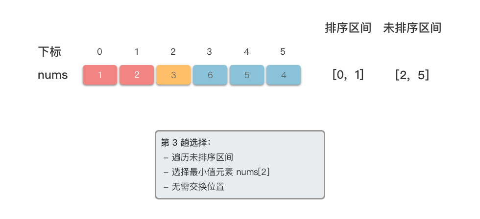 - 依次类推,对剩余未排序区间重复上述选择过程,直到所有元素都划分到已排序区间,排序结束。