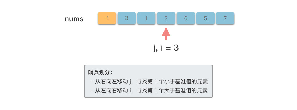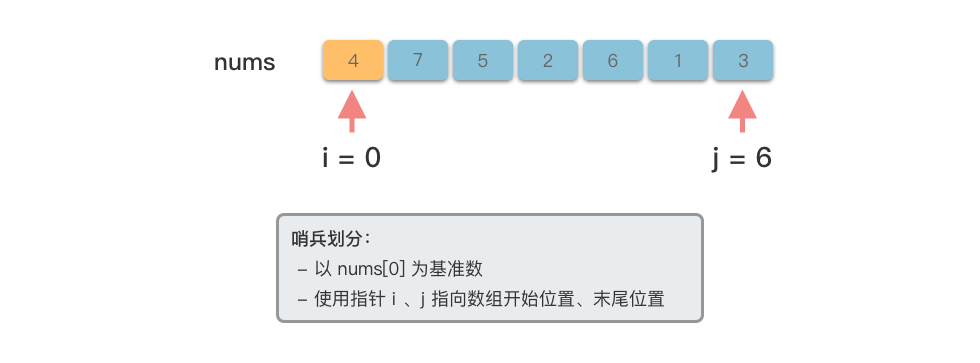 # 哨兵划分:以第 1 位元素 nums[low] 为基准数,然后将比基准数小的元素移动到基准数左侧,将比基准数大的元素移动到基准数右侧,最后将基准数放到正确位置上