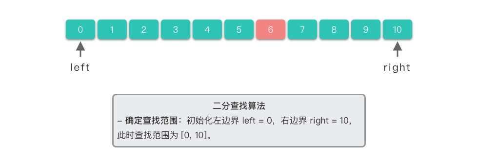 $left = 0$ (数组的起始位置),$right = 10$(数组的末尾位置)。此时查找范围为$[0, 10]$ 。 -