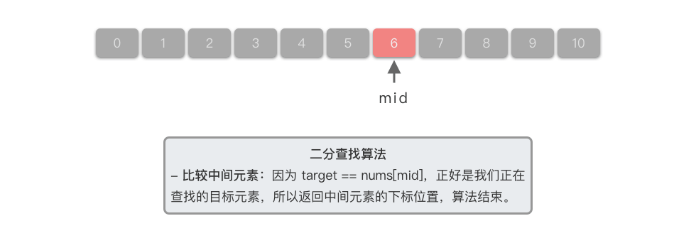 $6 == nums[6]$ ,正好是我们正在查找的目标元素,此时返回中间元素的下标位置,算法结束。