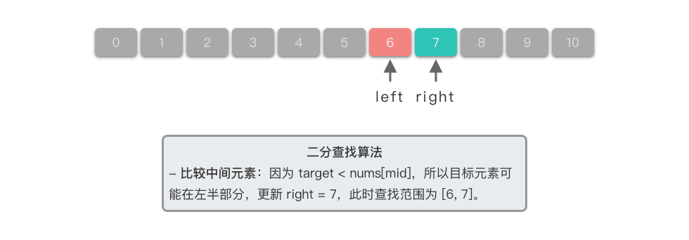 $6 > nums[5]$ ,所以目标元素可能在右半部分,更新左边界为中间元素的后一个位置,即$left = 6$ 。此时查找范围为$[6, 10]$ 。 -