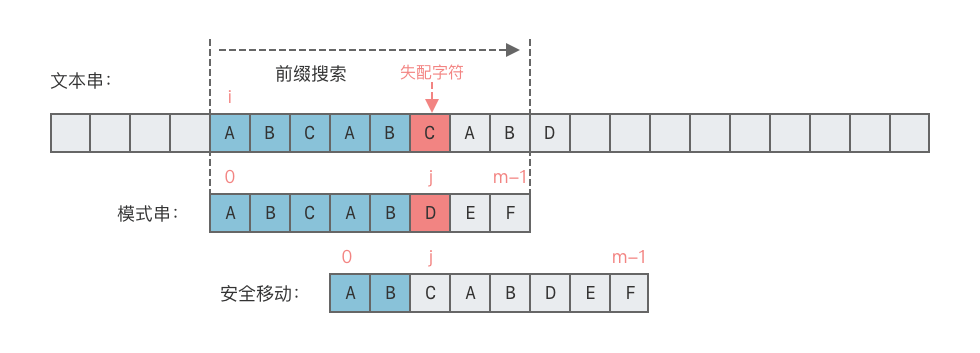$j = next[j - 1]$ ,直到$j == 0$ 时或前缀匹配成功时停止回退。 - 如果当前模式串前缀匹配成功,则令模式串向右移动