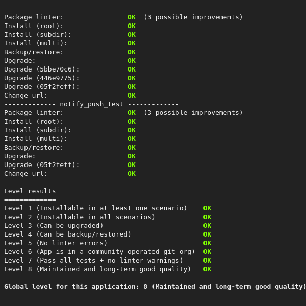 Two warnings Warning: Warn your packagers /!\ Patch /var/cache/yunohost/app_tmp_work_dirs/app_mxf0yrlh/patches/main/00-add-logout_url-conf.patch failed to apply Warning: Command "/var/www/nextcloud__2/cron.php" is not defined. https://paste.yunohost.org/raw/vidogobuko After a few minutes of testing, all seems to work: files, talk, agenda, contacts, collectives... |