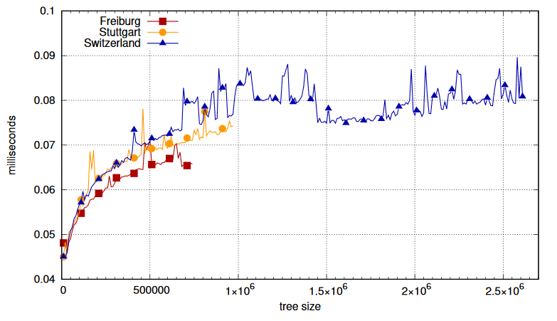 The following is a benchmark of Closy version 1.0. The experiment consists of continuous insertion of nodes, for each of three road networks respectively, and then measuring random nearest neighbor queries, i.e. the execution time of the algorithm. Measurements are done for tree sizes of 1, 10000 and then in steps of