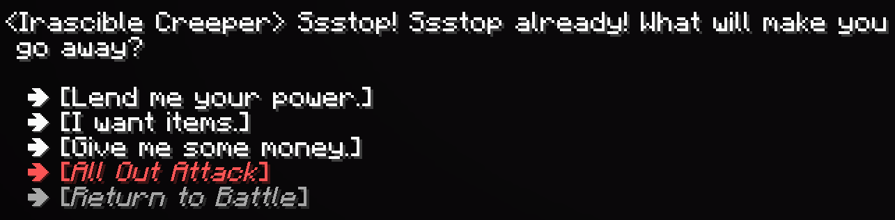 mobnegotiation.power- Allows for negotiation of buffs (Default)mobnegotiation.items- Allows for negotiation of items (Default)mobnegotiation.money- Allows for negotiation of money if Vault is installed (Default)mobnegotiation.attack- Allows for All Out Attack, an OHKO move (Default)mobnegotiation.*- All permissions (OP)