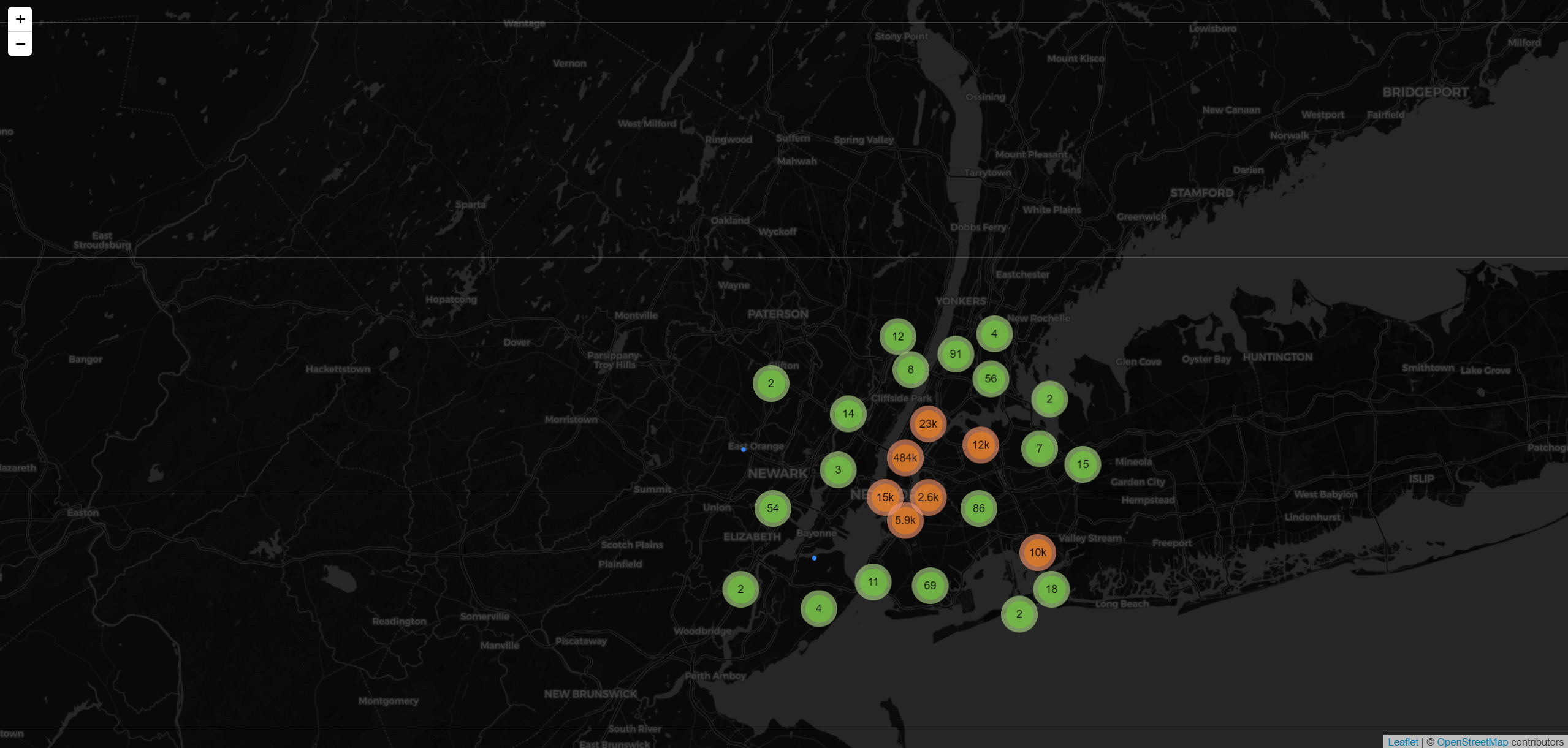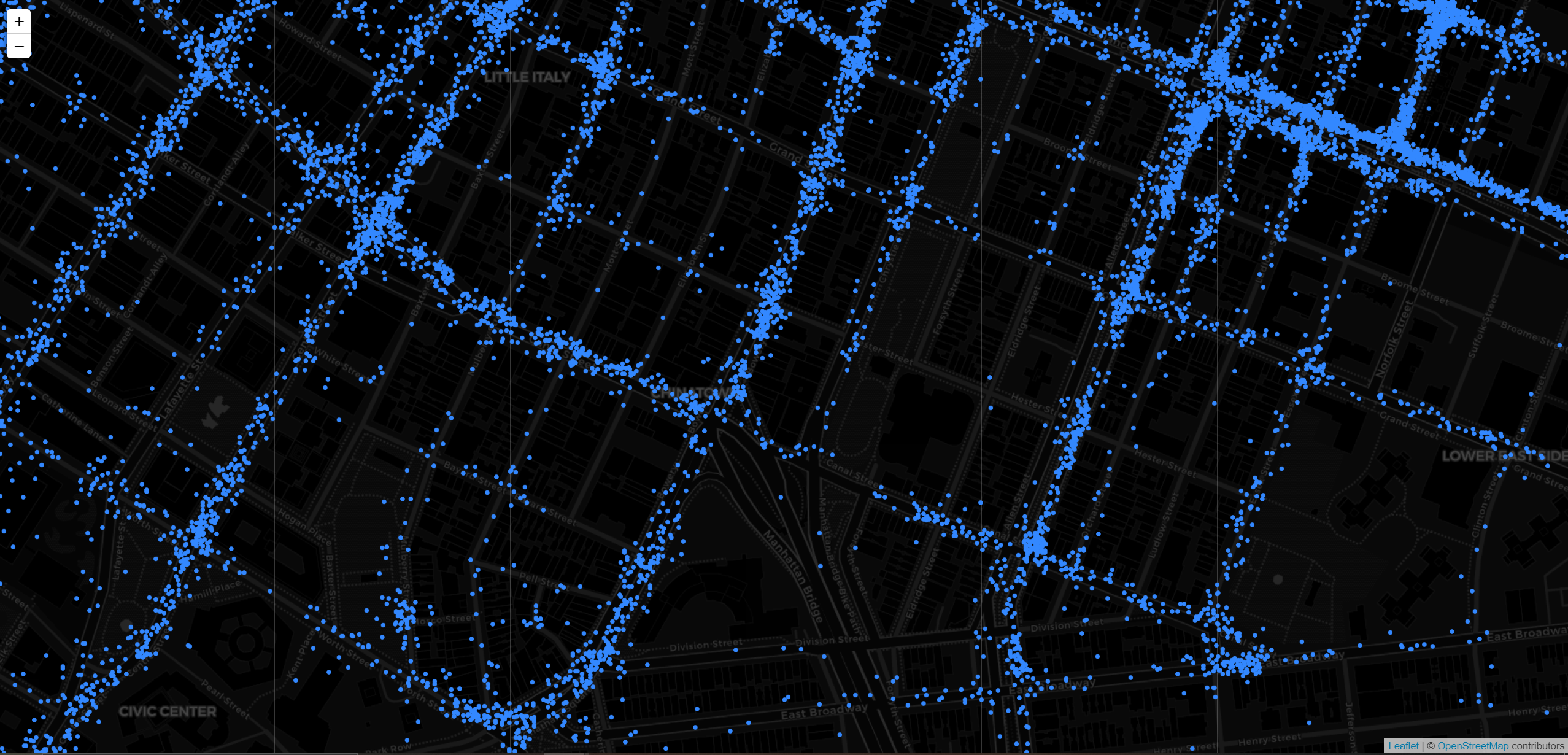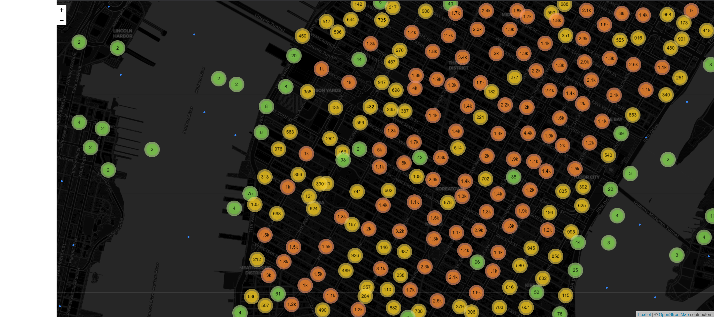 New York City has publicly released Taxi trip data for every trip from every taxi from 2014 to 2018. The web application shows the dataset of the pick-up locations on the map in New York City during January, 2015. When zooming down to an individual point, it will be displayed as a blue circle marker. On the other hand, zooming out will show clusters representing points in the specific area.