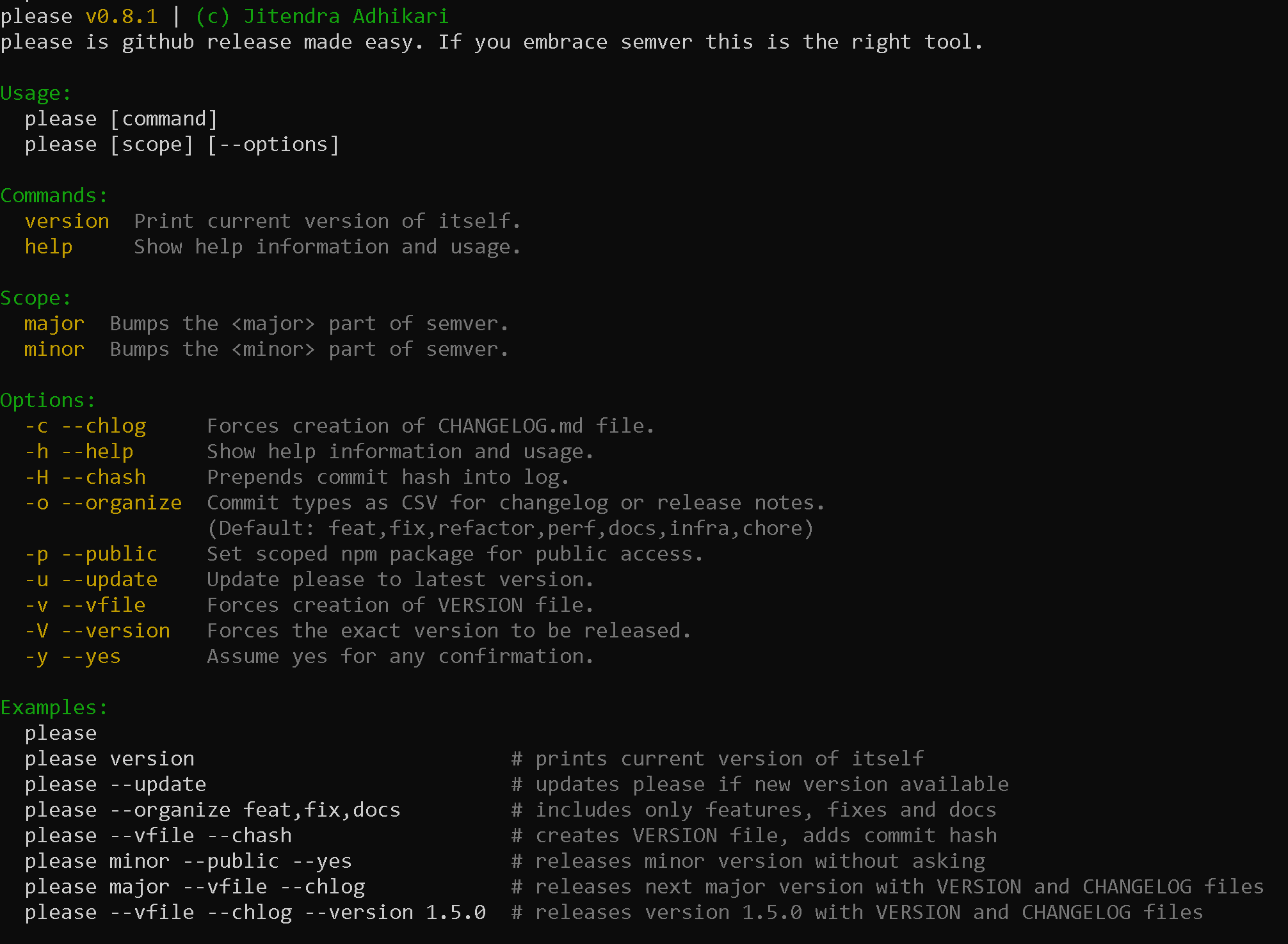 please [Scope|Command] [Options]please v0.11.0 | (c) Jitendra Adhikari | please is semver release made easy.