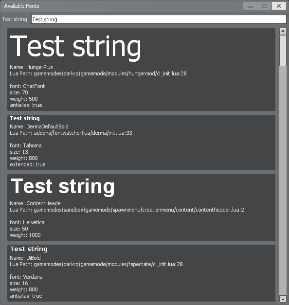fontviewer Simple addon for GMod that allows view all Lua registered fonts in-game. How to use Enter fontviewer command in client console. Look for font. Press LMB to copy Lua font name or RMB to copy font Lua path. Menu