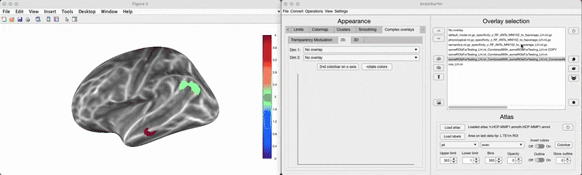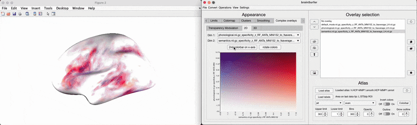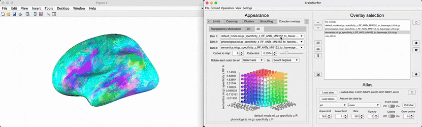 Notice that in the video above we set up a 2D colormap after setting up a transparency modulation and the new 2D colormap is still modulated by the map we previously selected. When setting up either 2D or 3D colormaps, you'll have better visualizations if no thresholds are applied to the overlays, which is in line with how I think of the utility of this feature--to visualize interactions among surface maps where there isn't a super clear significance threshold that can be set (e.g., component maps from PCA or ICA, etc). Visualizations of thresholded maps suffer when there is increasingly less overlap between the maps because this is more likely to result in vertices mapping on the very far edges of the square colormap, which creates sharp contrast between colors in the patch.