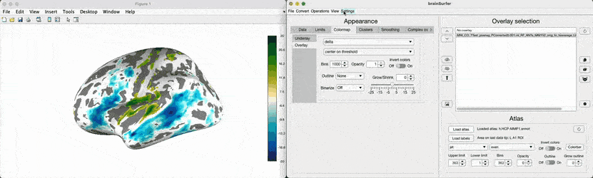 Note that the video below shows a slightly different colormap creator GUI layout than the one which comes with the most recent version of BrainSurfer. Mostly, buttons have just been rearranged so you should be able to navigate your way around this new GUI without too much trouble. However, the new GUI does also come with an additional tab that gives you a little more flexibility in creating colormaps. Instead of having a continuous interpolation of colors between two end points and one midpoint, you can now combine two existing colormaps, allowing you to have much higher contrast around the middle of the colorbar (effectively allowing for two midpoints).