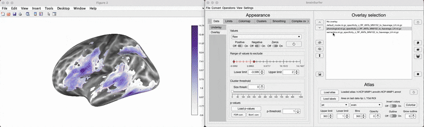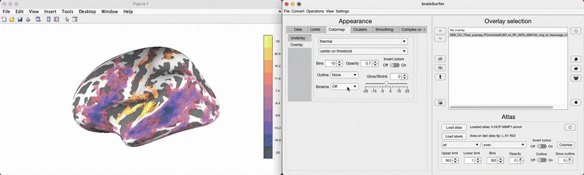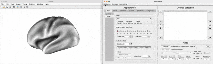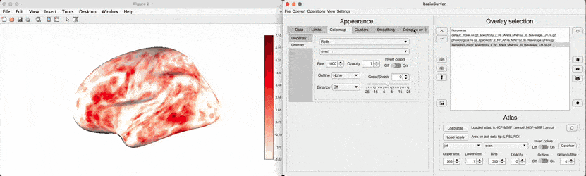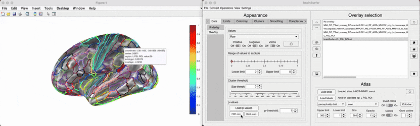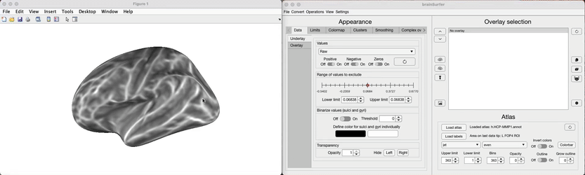 Atlas files can be .annot files, nifti files, or cifti files. You can also load in a .label as an "atlas". Note, that you will need to provide independent labels if your atlas is a nifti file since only cifti and .annot files contain label information inside them. You can provide labels as a .txt file of brain structures where the indexing of the areas in the atlas matches the values in your nifti file, or as an .xml file (like those used in FSL; but make sure indexing starts at 1 not 0). Providing an xml file with indexed structures will mean that you can have more structures in your atlas than are present in the nifti file (the same is true for cifti and .annot files, but not for a nifti file where labels are provided as a .txt). BrainSurfer comes with the Harvard-Oxford atlas projected into fsaverage space, and the HCP MMP1 atlas, which was made with the fs_LR template but which I've projected here onto fsaverage space as well. MMP 1.0 is the default atlas for both fsaverage and fs_LR templates and will be loaded automatically whenever a surface with either 163k or 32k vertices is loaded. Again, keep in mind the possibility that a non-template surface you load contains a number of vertices that matches either of these templates, in which case the default atlas information displayed will not be accurate to the surface.