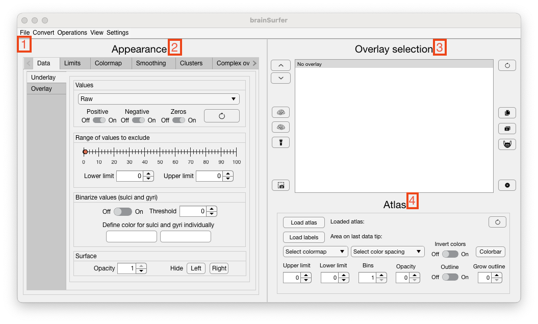 Overlays are always patched on top of surfaces, although it is possible to load overlays before patching a surface (this is not true for atlases or morphological data). Options for loading underlays and overlays are contained in the file menu (labeled area 1 in the image below), which is typically where the workflow in BrainSurfer will start.