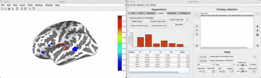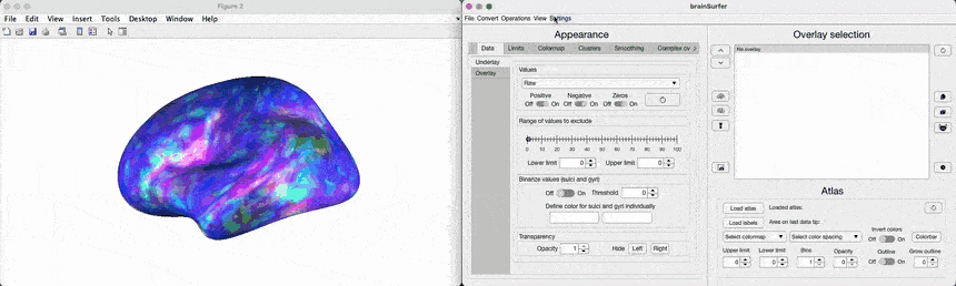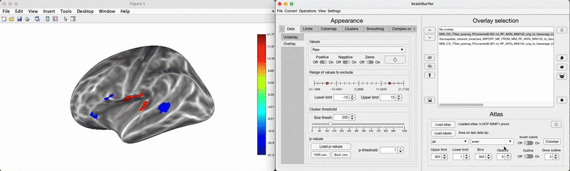 It serves to quickly create pretty figures from data you have already processed and analyzed elsewhere. It supports projecting data from volume space onto freesurfer's fsaverage and connectome workbench's fs_LR (s900) spaces. It's also compatible with a wide range of file types that store surface data (cifti, nifti, gifti, and freesurfer's label, annotation and morphology formats lilke .curv), and can be easily used to convert files between these formats. BrainSurfer can also perform lots of operations on surface maps (e.g., thresholding based on ranges of values, cluster sizes, and p-values, but also outlining clusters, smoothing, combining, masking, and averaging maps, and lots of other stuff) and can take automated standardized screenshots of large numbers of surface maps. Its visualization capabilities include the ability to modulate the transparency of surface maps by other maps, and to represent two to three surface maps on one mesh using 2-D (square) and 3-D (cube) colormaps. It contains a GUI for creating your own colormaps and supports saving GUI states so that you can share surface data visualizations with other users exactly as you've set them up in BrainSurfer, even if those users don't have the files you used to generate the visualizations.