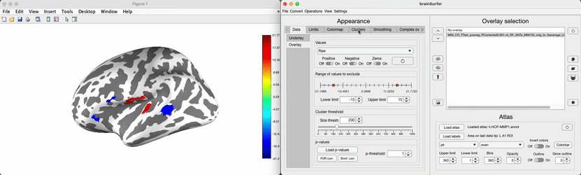 To save some memory, there are a couple buttons in BrainSurfer that produce effects that either aren’t saved at all, or saved in a coarse way. For example, if you manually change the color of a cluster inside an overlay, this change is not permanently saved and cannot be saved to any file. In addition, you can’t save changes to overlay colorbar orientations to a GUI save state. It’s also possible that if you are loading a GUI save state with custom binarized sulcal/gyral colors that you will have to invert the colors to match the original visualization. Finally, you might manually have to tell BrainSurfer to use default colors attached to an atlas if the atlas colors from the original visualization do not match the loaded save state. Note, atlases that are loaded as part of the load GUI save state function are “turned off” by default (i.e., have opacity of 0 and colorbar is hidden).