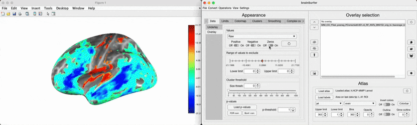 Loading overlays is as simple as choosing load overlays in the file menu, then selecting as many overlays as you'd like to load into BrainSurfer's listbox. When you load overlays, morphological files, or atlases you'll notice BrainSurfer printing some text to the MATLAB command window. You can ignore it, this is mostly for catching file loading errors in case you are running into issues. BrainSurfer uses process of elimination to determine your file type through a serious of catch statements. When loading a CIFTI file that contains information on both hemispheres, you'll notice BrainSurfer will separate the hemispheres and generate two overlays for the listbox. Each of these overlay names will be appeneded "(? HEMI)" like shown in the video below (I am using the fs_LR very inflated template here)