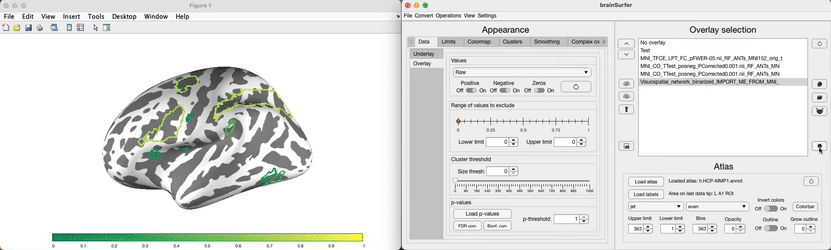 You'll notice each step in this projection process generates a series of output files. If you are converting volume space --> fsaverage --> fs_LR, you'll see new fsaverage and fs_LR files in whatever directory the original volume space file lived. These are appended with special strings. For example, if you load the nifti file "Visuospatial_network_binarized_IMPORT_ME_FROM_MNI.nii.gz" (contained in ./brainMapsforTesting) and select the "unthresholded" option when presented with a dialog box in BrainSurfer (we'll return to this), you'll see BrainSurfer generate two fsaverage files appended with "?H_RF_ANTs_MNI152_to_fsaverage.nii.gz", one for each hemisphere. These are the only files that would be produced if we had an fsaverage underlay. Since we have an fs_LR underlay you'll also notice BrainSurfer created two files with the exact same name as the fsaverage projections, but in the gifti file format. These files are still in fsaverage space, but gifti files are required for the connectome workbench which is why we've created them. I find it useful to have these files around for non-BrainSurfer reasons, but you can delete them if you're pressed for space since the data contained within them is redundant. The final set of files that will be produced are projected onto the fs_LR template and will be appended with the following string: "to_fs_LR.gii"