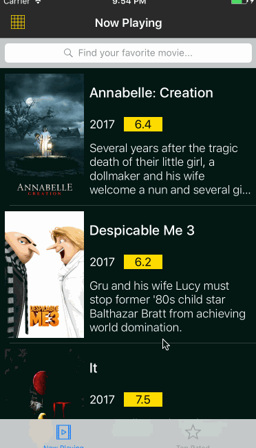 - User can view a list of movies currently playing in theaters. Poster images load asynchronously.